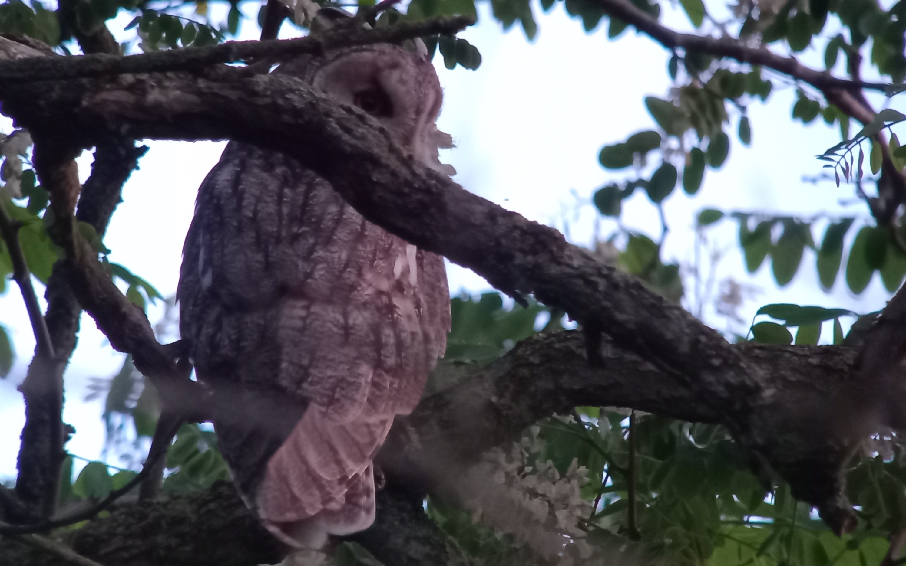De volwassen ransuil houdt me nauwlettend in de gaten. Bij iedere beweging of geluid kijkt de vogel om zich heen. Even lijken de rollen omgedraaid. Ransuil observeert vogelaar, in plaats van andersom. Het observeren is eigenlijk wederzijds. Ik kan de uil prachtig bekijken door mijn telescoop, de uil kan mij op een veilige manier observeren vanuit zijn boom. De takkelingen roepen aan één stuk door, zoals meestal het geval bij ransuilen. Het langgerekte gepiep is honderden meters verderop nog te horen. Even later vliegen de uiltjes wat verder de tuin in, maar ze blijven in de buurt. De volwassen ransuil blijft honkvast in zijn boom. Erg mooie waarneming zo op het einde van de avond.