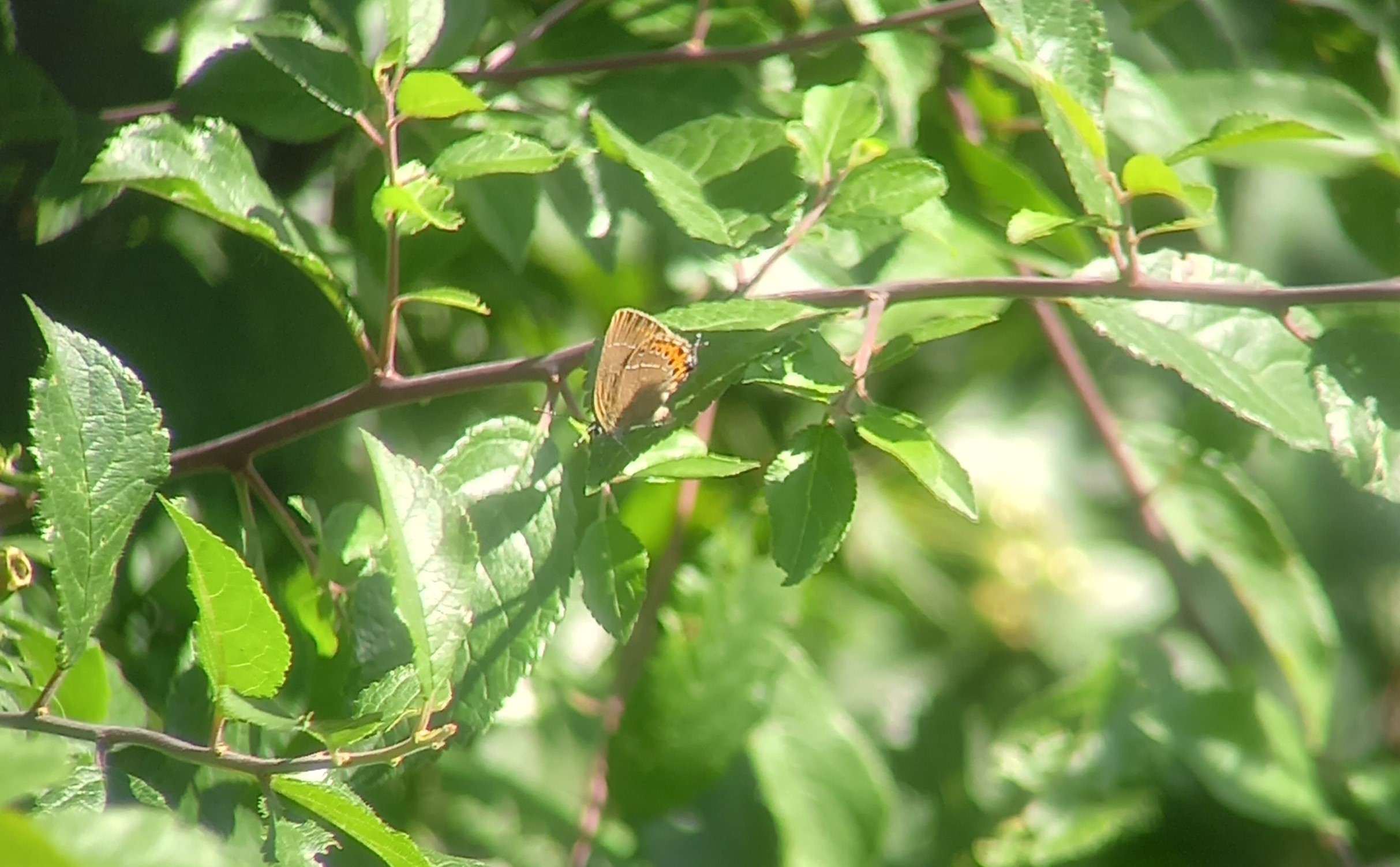 Dan is het even wachten en een kwestie van geduld hebben. Het diertje zou een kwartier geleden voor het laatst zijn gezien. De plek waar de pruimenpage voor het laatst is gezien wordt nauwlettend in de gaten gehouden. Dan wordt er vanaf de andere kant van de bosschage waar we staan geroepen dat het vlindertje in beeld is. Sprintje trekken en eenmaal aan de andere kant is het een kwestie van aanschuiven. De pruimenpage zit dichtbij, zonnend op een blad. Af en toe loopt het diertje of vliegt een stukje. Maar vrijwel continu in beeld, een beeldschoon vlindertje. Met de telefoon door de verrekijker weet ik wat bewijsplaatjes te schieten. Wat een prachtig moment weer, tientallen mensen die zo’n klein beestje aanbidden. Heel rustig en volop genietend.