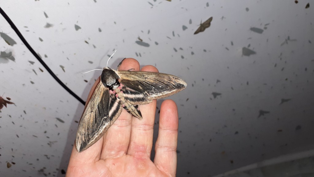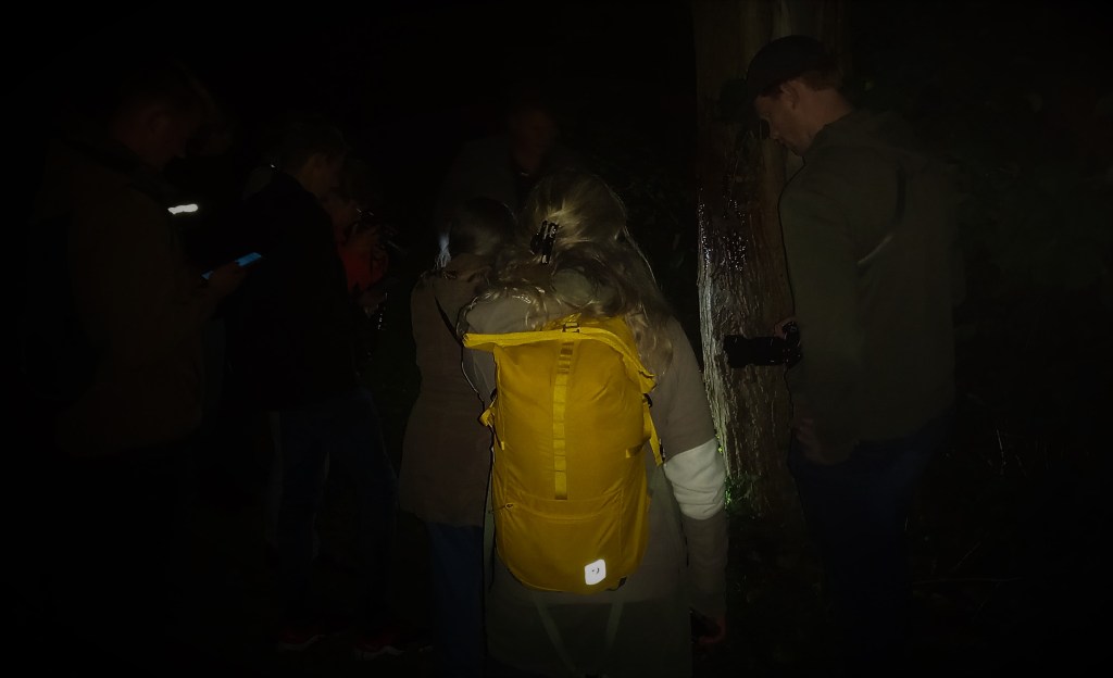 Weer terug bij het beginpunt, waar de lichtopstelling met laken staat, zijn het enkel buxusmotten die op het licht zijn af gekomen. Het is nog ietwat aan de vroege kant voor het gros van de nachtvlinders. Jeroen en Merel hebben ook een lichtval geplaatst. In deze val, die bestaat uit een bak met trechter met daarboven een felle lamp, worden vlinders gelokt die rondfladderen boven de bak totdat ze per ongeluk door de trechter de bak in vliegen. Vervolgens kruipen de nachtvlinders tussen geplaatste eierdozen. Zo worden er vanavond 3 lokmethodes gebruikt: bomen smeren, lichtopstelling met laken en lichtval.