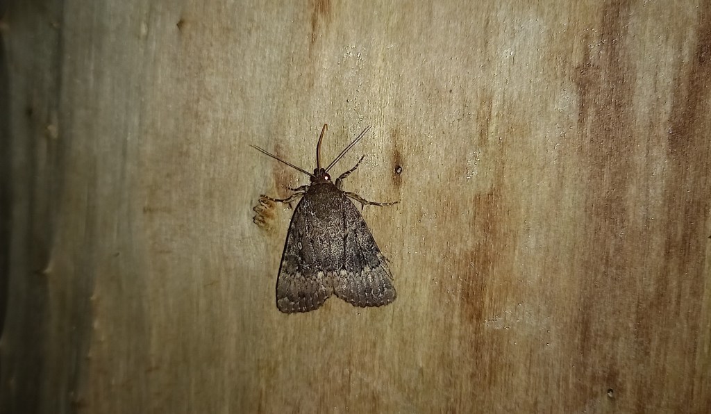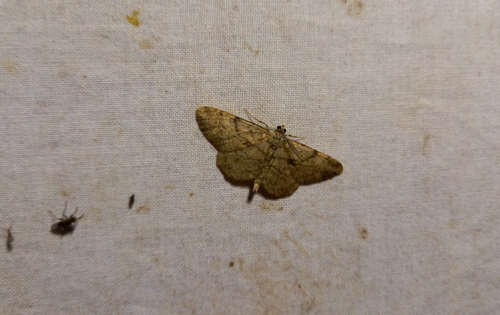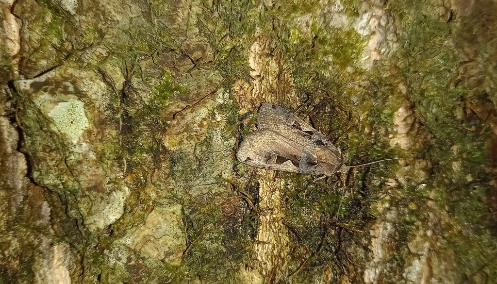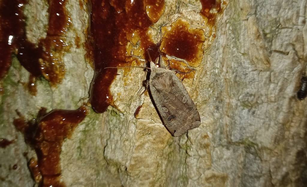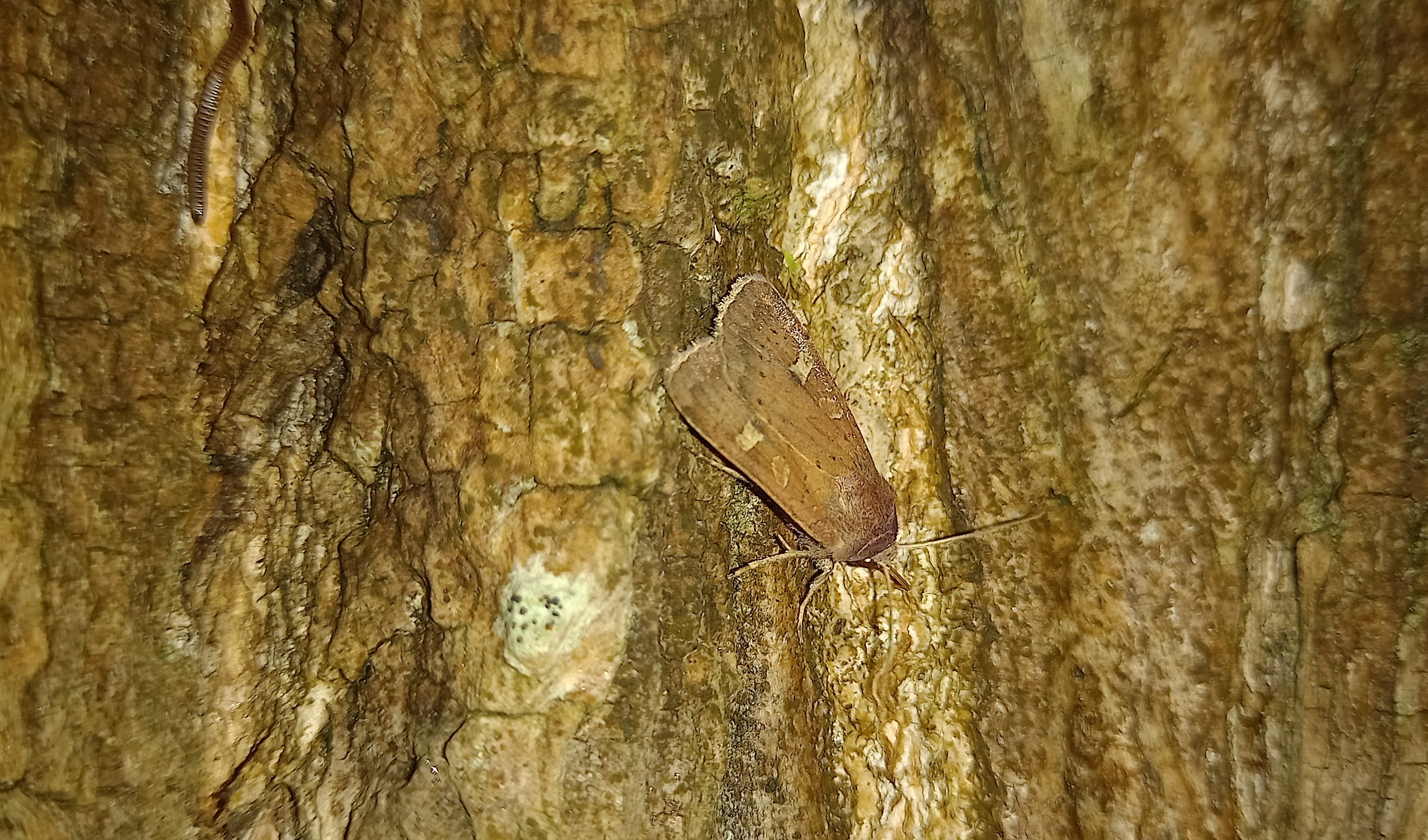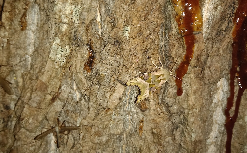 Tijdens een 2e ronde langs de bomen hebben we meer succes. De aantallen piramidevlinders groeien snel, maar ook vierkantvlekuil is goed vertegenwoordigd. Her en der een bruine snuituil, zwarte c-uil, huismoeders en kunstwerkjes in de vorm van agaatvlinders. Ook leuk zijn goudvenstertje, donkere marmeruil en schimmelspanner.