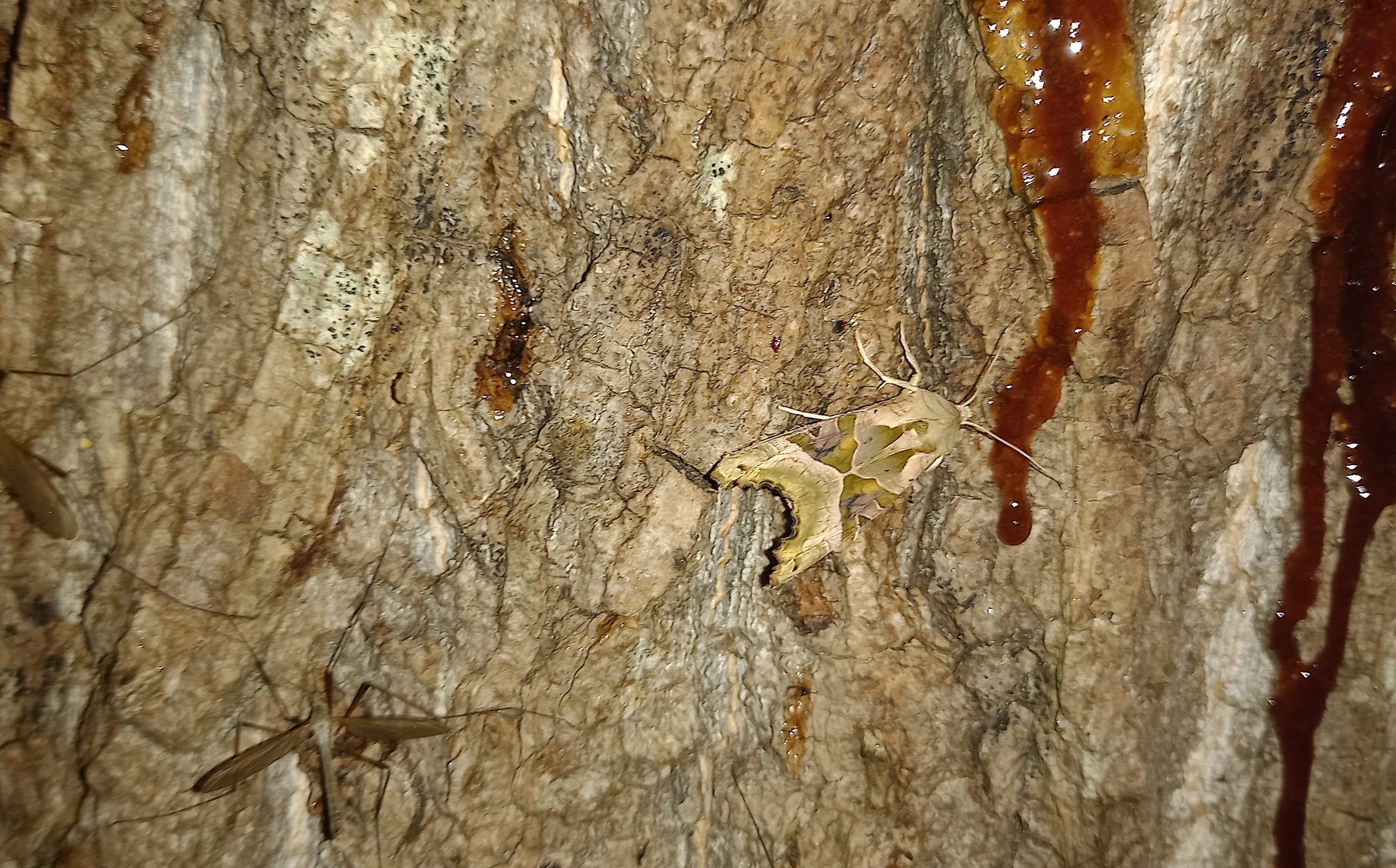 Op de vrijdagavond stond er een nachtvlinderavond gepland in het Leeuwarderbos, georganiseerd door Jeroen en Merel. In het Leeuwarderbos is het altijd leuk en gezellig nachtvlinderen. Reden voor Siska en mij om aan te sluiten bij deze mooie avond. Als we even na 20:00 arriveren op de parkeerplaats aan de Havanklaan zien we verderop al een lichtopstelling met wit laken staan. Het toeval wil dat we net op tijd zijn om met Merel een route te lopen langs bomen die ingesmeerd zijn met een zoet mengsel, waar hopelijk nachtvlinders op af komen. Tijdens een 1e ronde langs de bomen zijn het vooral pissebedden, hooiwagens en slakken die we zien, maar een 1e piramidevlinder bijt het spits af.