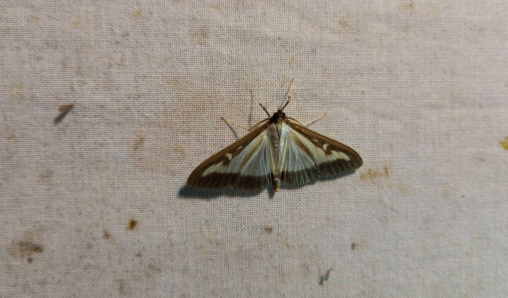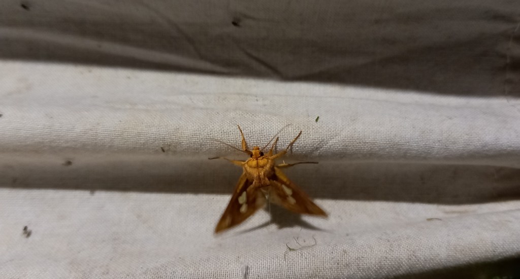 Terug bij de lichtopstelling met laken zijn de aantallen nachtvlinders ook gegroeid. Naast buxusmotten ook een enkele taxusspikkelspanner, maansikkeluil en een zeldzame populierengouduil, nieuw voor het Leeuwarderbos. Bij het verlichte rustpunt vinden we ook enkele nachtvlinders. We besluiten het niet te laat te maken. We praten gezellig bij onder het genot van nachtvlinders en keren voldaan huiswaarts. Een geslaagde avond met leuke soorten. Jeroen en Merel, bedankt weer voor het organiseren van een mooie vlinderavond. Hieronder nog wat sfeerplaatjes van soorten.