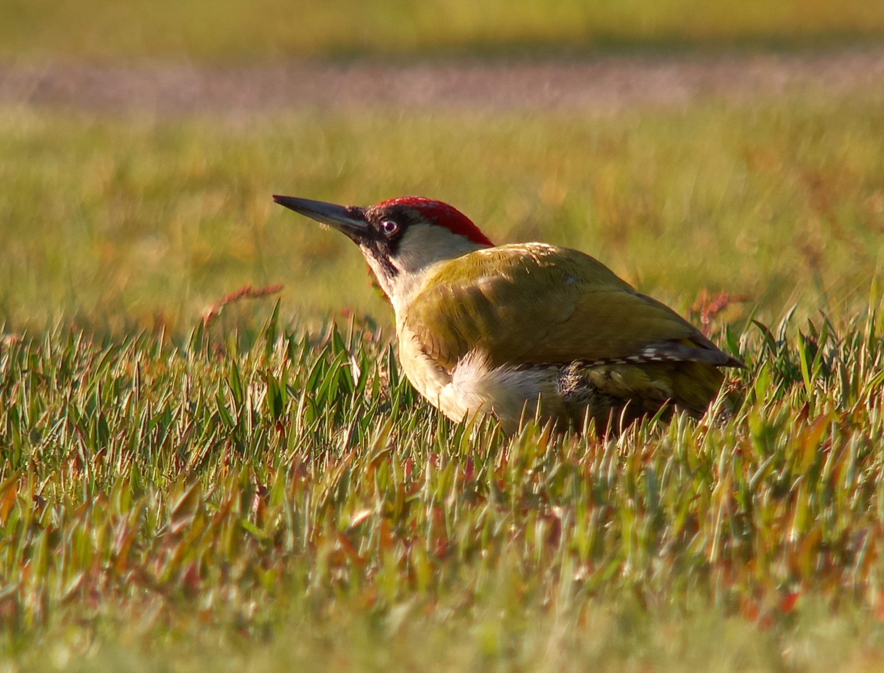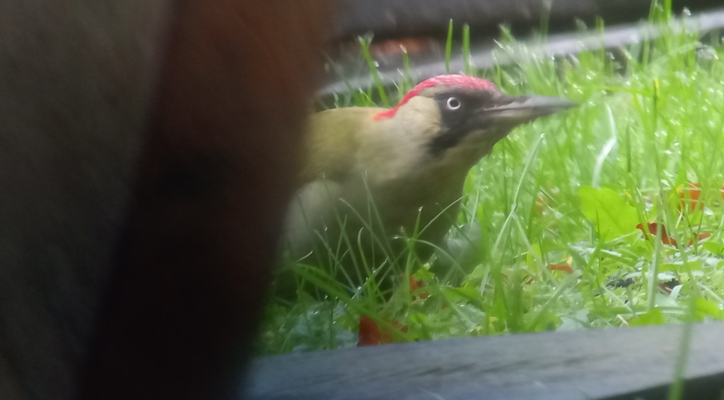 We zoeken vervolgens vergeefs naar groene specht, een schitterende maar schuwe soort om vast te leggen. Deze soort komt algemeen voor in Beetsterzwaag, maar laat zich vandaag niet vinden. Zelfs een lachende roep van deze felgekleurde specht is ons tijdens de zoektocht niet gegund. Pas aan het einde van de middag, als Folkert Jan alweer thuis is, hoor ik vanuit huis een groene specht roepen. Ik hoorde al vaak een groene specht vanuit huis, maar de desbetreffende vogel in beeld krijgen bleef een uitdaging. Pas 2 keer zag ik een vogel mooi foerageren in de tuin, een grasveldje met daaromheen veel bomen en struiken. Verder zag ik kortstondig eenmaal een groene specht zitten in een acaciaboom. Elders in Beetsterzwaag had ik dit eerder dit jaar meer succes. Op een mooie ochtend vond ik een vogel op een grasveldje met wat bomen die zich fantastisch mooi liet benaderen en bewonderen.