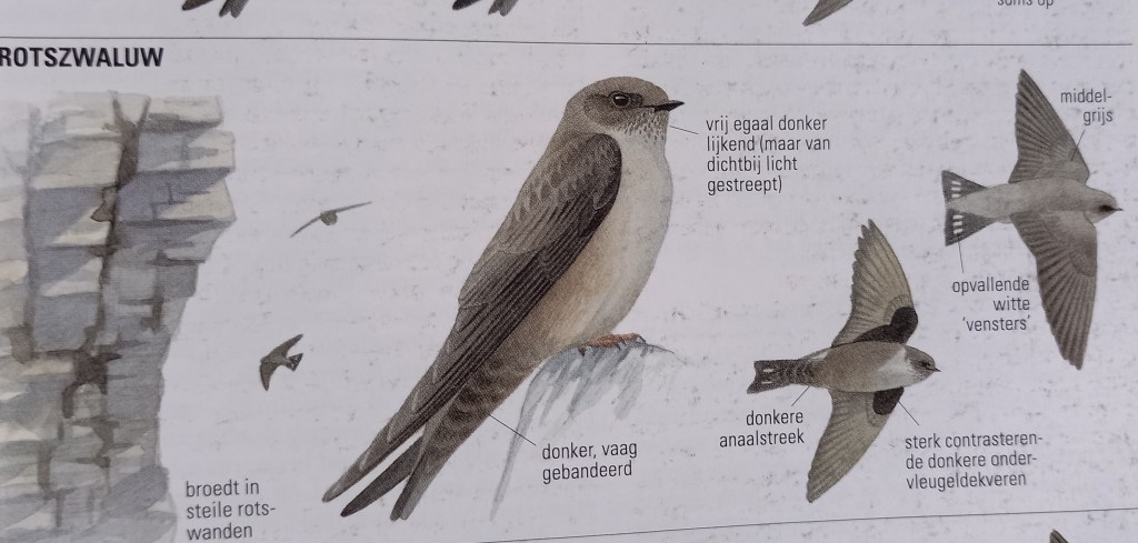 Als we de dijk oprijden bij Doornenburg zien we al snel een rij auto’s en mensen staan. Auto parkeren en gauw eruit. De zon heeft inmiddels plaatsgemaakt voor donkere wolken en regen, hopelijk geen slecht voorteken. Nee, absoluut niet. We zien vrijwel meteen na het uitstappen de Rotszwaluw vliegen, fantastisch! Al foeragerend vliegt de vogel rondjes boven onze hoofden, regelmatig zeer dichtbij. Een vrij forse zwaluw met brede en spitse vleugels. Grijswit tot bruin van onderen met op de onderzijde van de vleugels donkere onderdekveren die contrasteren. De bovenzijde is vaal bruingrijs. Met de telefoon weet ik enkele matige foto’s en filmpjes te maken.