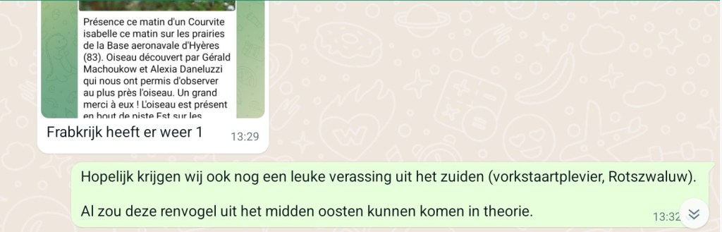 Dan stuurt Folkert Jan een foto door van een Renvogel in Frankrijk, de 13e waarneming van deze uit het verre zuiden (of Midden-Oosten) afkomstige steltloper voor het land. In 2021 mocht vogelend Nederland genieten van een exemplaar in het Noordhollands Duinreservaat. Ik beantwoord het appje van Folkert Jan met de woorden: “Hopelijk krijgen wij ook nog een leuke verassing uit het zuiden, bijvoorbeeld Vorkstaartplevier of Rotszwaluw“.