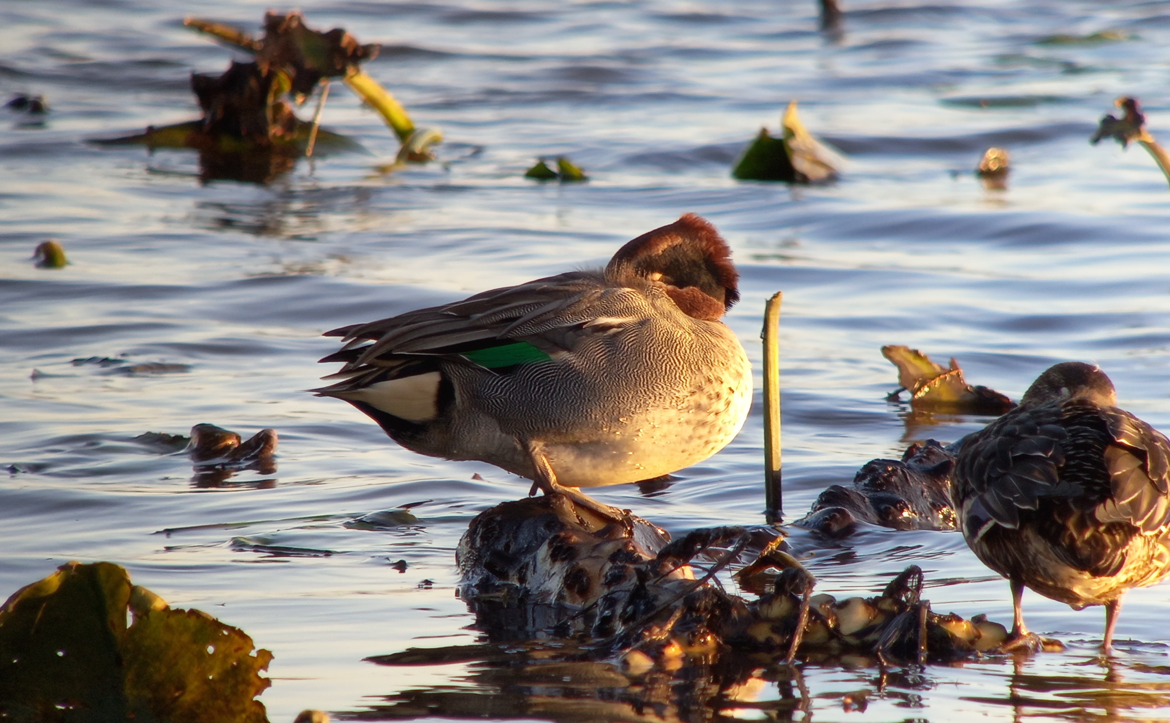 De zandwinplas bij de A7 heeft een enorme aantrekkingskracht op watervogels zoals eenden, ganzen, zwanen en futen. In de winter zitten er grote aantallen Wilde Eend, Kuifeend, Krakeend, Smient, Slobeend en Wintertaling. In mindere mate Tafeleend en Pijlstaart. Met een beetje geluk tref je er ook schaarsere eenden zoals Bergeend, Grote Zaagbek, Nonnetje en Brilduiker. De Fuut is hier jaarrond aanwezig terwijl Dodaars in kleine aantallen overwintert. Wat betreft ganzen is het vooral in de winter genieten van honderden tot duizenden Kolganzen, Brandganzen en natuurlijk ook Grauwe Ganzen, die hier ook broeden. Een minder algemene soort is Toendrarietgans. Ook zitten er vaak veel meeuwen op de plas, zoals Stormmeeuw en Kokmeeuw.