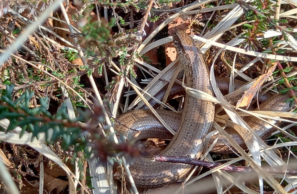 Helaas leidt dit veelal tot verstoring. Een Hazelworm zou een makkelijke prooi kunnen zijn ook, sloom en fragiel als ze zijn. Gelukkig loopt het druk pratende gezin snel verder, echt aandacht voor de natuur lijken ze niet te hebben. Opgelucht dat deze druktemakers uit ons zicht zijn, zetten we onze zoektocht naar reptielen voort. De zon schijnt behoorlijk krachtig en het voelt heerlijk warm op de hei. We zeggen nog tegen elkaar: “het moet toch echt wel kunnen nu, een Hazelworm“. En dan opeens, weliswaar in de schaduw, zie ik een Hazelworm opgerold liggen tussen de vegetatie. Een Hazelworm op 3 maart, mijn vroegste ooit. We maken wat foto’s en laten het dier verder met rust. Het is een klein wonder dat het dier er nog ligt, nadat een loslopende hond door de vegetatie heen heeft gelopen.