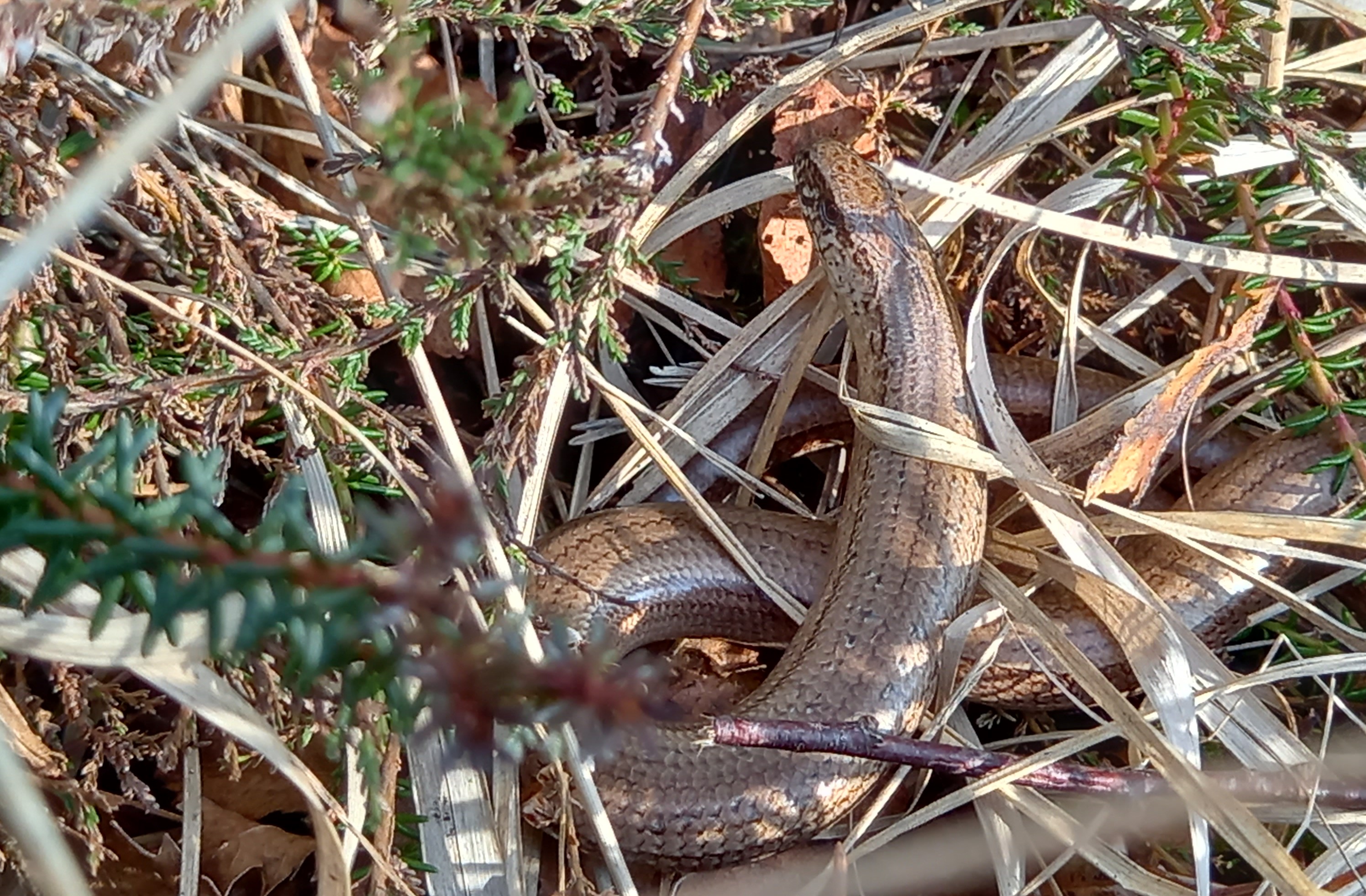 Helaas leidt dit veelal tot verstoring. Een Hazelworm zou een makkelijke prooi kunnen zijn ook, sloom en fragiel als ze zijn. Gelukkig loopt het druk pratende gezin snel verder, echt aandacht voor de natuur lijken ze niet te hebben. Opgelucht dat deze druktemakers uit ons zicht zijn, zetten we onze zoektocht naar reptielen voort. De zon schijnt behoorlijk krachtig en het voelt heerlijk warm op de hei. We zeggen nog tegen elkaar: “het moet toch echt wel kunnen nu, een Hazelworm“. En dan opeens, weliswaar in de schaduw, zie ik een Hazelworm opgerold liggen tussen de vegetatie. Een Hazelworm op 3 maart, mijn vroegste ooit. We maken wat foto’s en laten het dier verder met rust. Het is een klein wonder dat het dier er nog ligt, nadat een loslopende hond door de vegetatie heen heeft gelopen.