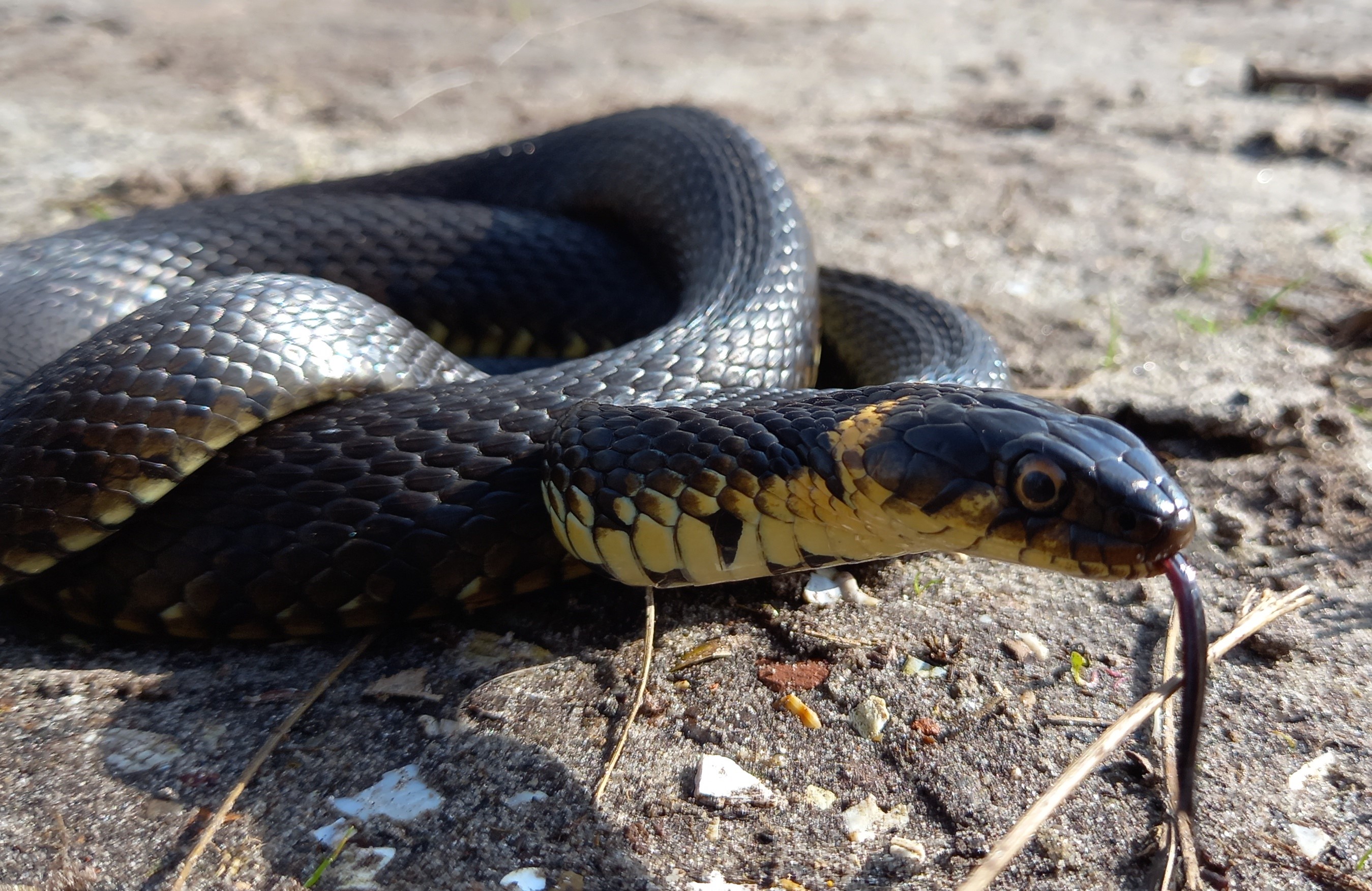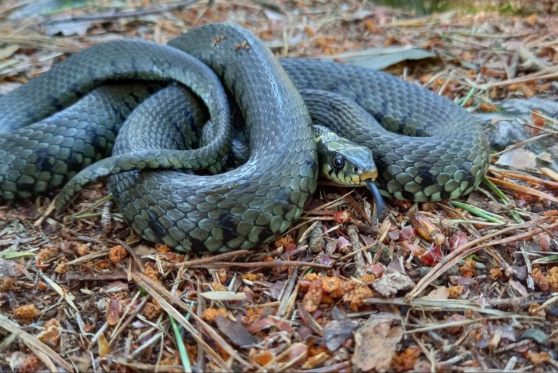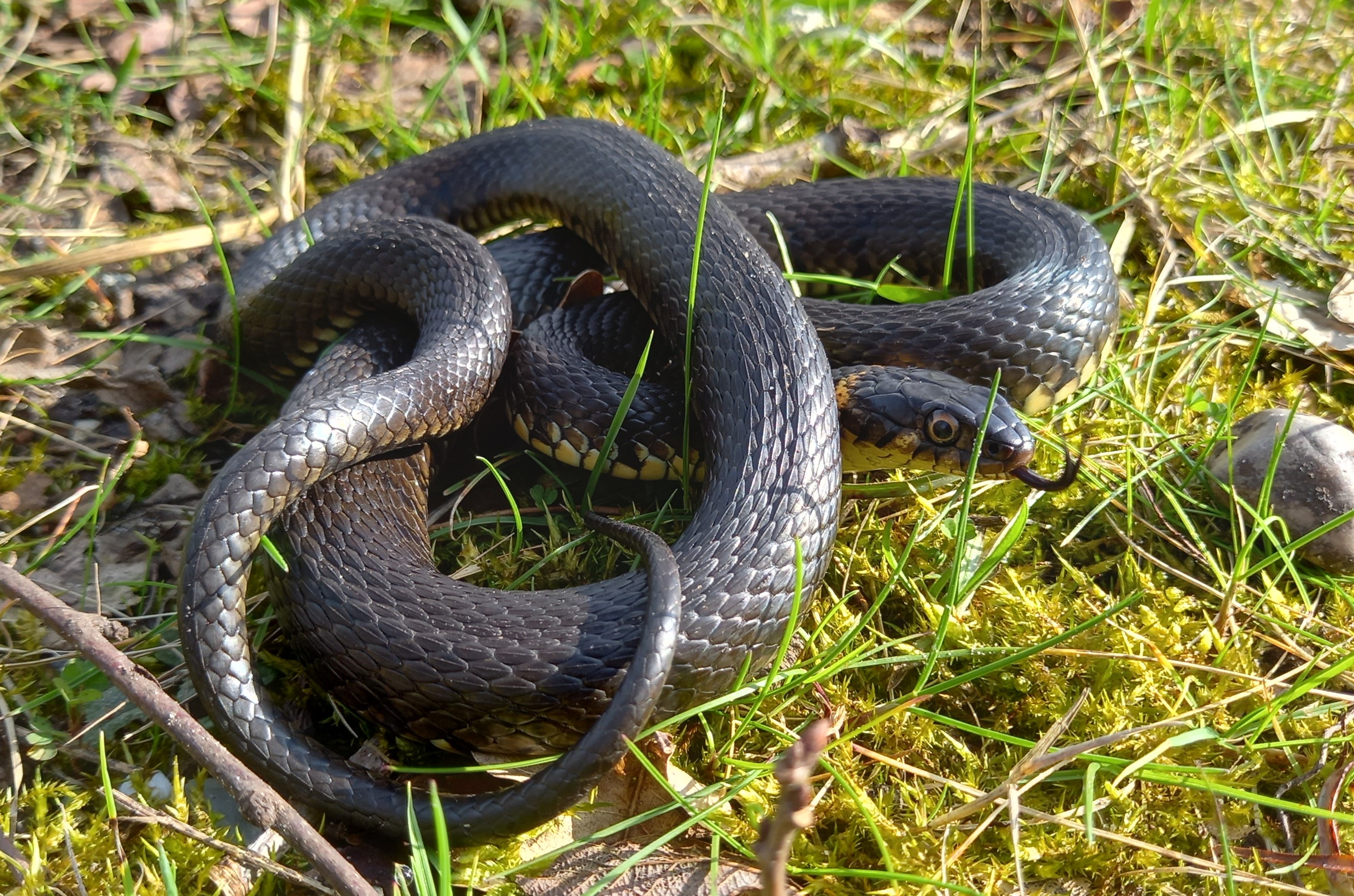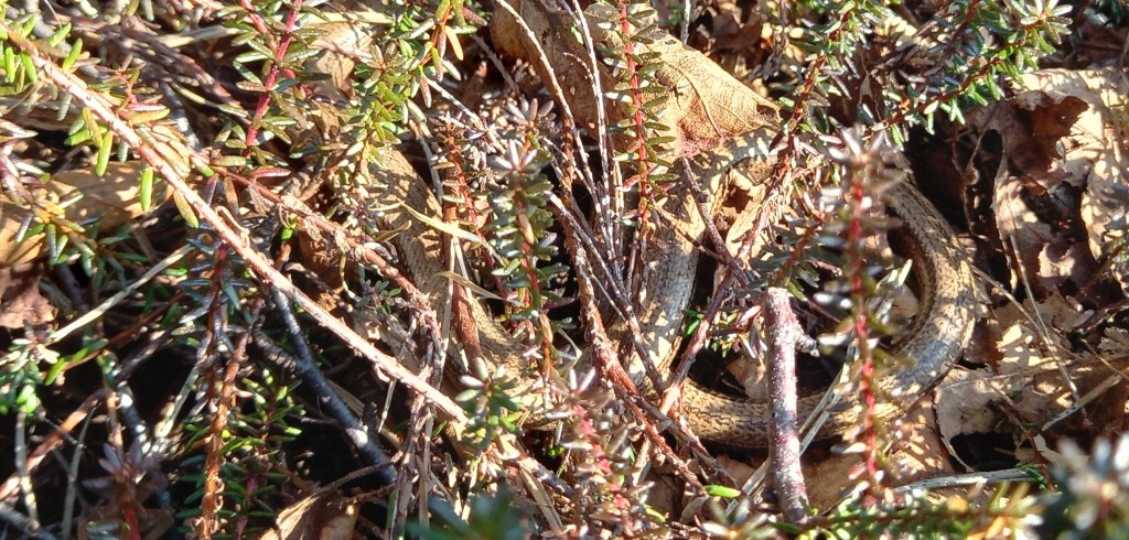 Op 14 maart diende zich de volgende zonnige lentedag aan. Ik zag op de Liphústerheide naast enkele Levendbarende Hagedissen, ook de eerste Ringslang van het jaar. Een prachtig vrouwtje van bijna 1 meter lang. Het dier kwam tevoorschijn uit een graspol en gleed de voorjaarszon tegemoet. Vervolgens nam ze een uitgebreid zonnebad. De Ringslang was prachtig te volgen en leek niet in de gaten te hebben dat ze werd bewonderd door een gelukkige natuurvorser. Op een gegeven moment zag ik haar opgerold liggen langs een sloot, deels verborgen tussen struiken. Even later lag ze weer open en bloot te zonnen. En mijn geluk was nog niet op, want later op de dag trof ik een Hazelworm op een voor mij nieuwe locatie, erg leuk. Hoeveel Hazelwormen zullen er stiekem zitten in Beetsterzwaag?