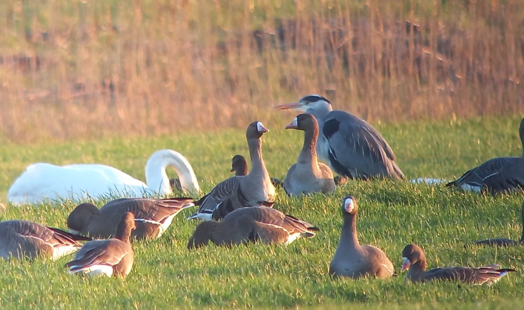 De volgende dag begint met een vleugje winter en voorjaar door elkaar heen. Winters koud, ijzel, rijp. Een mooi gezicht dat laagje witte aanslag. Ondanks de kou zingen veel vogels erop los, Koolmezen, Pimpelmezen, Boomklevers, Boomkruipers. Ook 2 Zanglijsters zijn lekker druk. Overal territoriale Grote Bonte Spechten. Zelfs de eerste Ooievaars hebben hun nestpaal alweer geclaimd. ’s Middags maak ik een flinke fietstocht in de hoek Beetsterzwaag / Terwispel / Tijnje / Nij Beets. Een eerste stop in natuurreservaat Van Oord’s Mersken levert een Sperwer, Brilduiker, Grote Zilverreigers, Ringmussen en een tiental Nonnetjes. In de verte zie ik duizenden vogels in paniek, ganzen, eenden, zwanen, spreeuwen, kievieten. Dan kan maar 1 ding betekenen. Herhaaldelijk de lucht afspeuren levert desondanks geen roofvogel op.