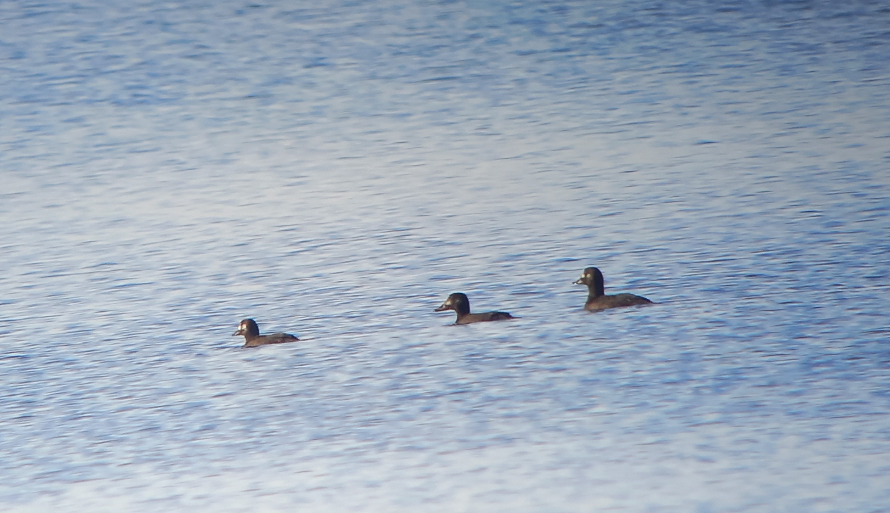 Het is ook vandaag fantastisch weer. Geen zuchtje wind, mooi licht en zonnig, droog, winters. Via Haren fietsen we naar het Paterswoldse Meer, altijd leuk en spannend vogelen. Er wil nog weleens een leuke verassing zitten. Zo moet ik even terugdenken aan een Kuifduiker enkele jaren terug. Bij het strandpaviljoen Paterswoldse Meer nemen we even pauze. Maar niet voordat we wat leuke watervogels hebben gezien, dus scan ik vol goede moed het meer af. Al snel zie ik een tiental Grote Zaagbekken en enkele Brilduikers. Verder zitten er vooral veel Aalscholvers, Futen, Meerkoeten en Kuifeenden. Op een gegeven moment zwemmen 3 ‘vreemde eenden’ door mijn telescoopbeeld. De eenden foerageren op enige afstand, veel duikend, mosselen vangend, maar komen langzaam wat dichterbij. Als ik de vogels wat langer kan bekijken zie ik meteen dat het iets bijzonders is, namelijk Grote Zee-eenden, een schaarse soort in het binnenland. Op basis van het koppatroon met opvallende lichte wangvlek, grote witgele gezichtsvlek tussen ogen en snavel, het ontbreken van witte spiegels in de vleugels, lijkt het om de 3 juveniele vogels te gaan.