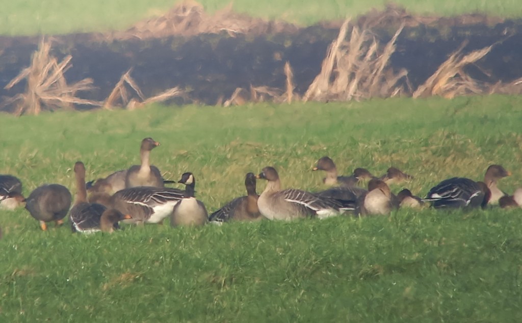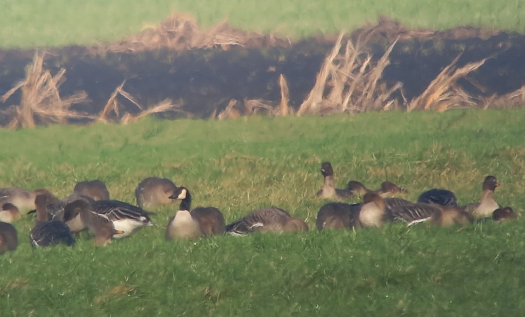 Na een snelle fietstocht arriveer ik bij het Scandinavische dorp aan het Paterswoldse Meer. Telescoop opstellen en vrijwel meteen de vogel, hoewel op flinke afstand, leuk in beeld. Een mooie toevoeging aan de jaarlijst en meteen een goed begin van de nieuwe week. Vervolgens fiets ik terug naar de stad, waar ik met Folkert Jan heb afgesproken bij Beauty Perfection JL’s, de kapperszaak van Jannie. Vanaf hier rijden we naar Stadskanaal voor de Hutchins’ Canadese Gans. Onderweg blijkt dat de vogel weer is opgevlogen door een vliegtuig en uit beeld is. Toch weer spannend. Gelukkig wordt de vogel vlak voor aankomst wederom teruggevonden op ongeveer dezelfde locatie. Bij aankomst langs de Zijdstukkerweg zien we meerdere vogelaars, turend door de telescoop. Dat lijkt een goed teken. We zien vanuit de auto vele ganzen, Knobbelzwanen, Wilde Zwanen, maar nog geen Canadees.