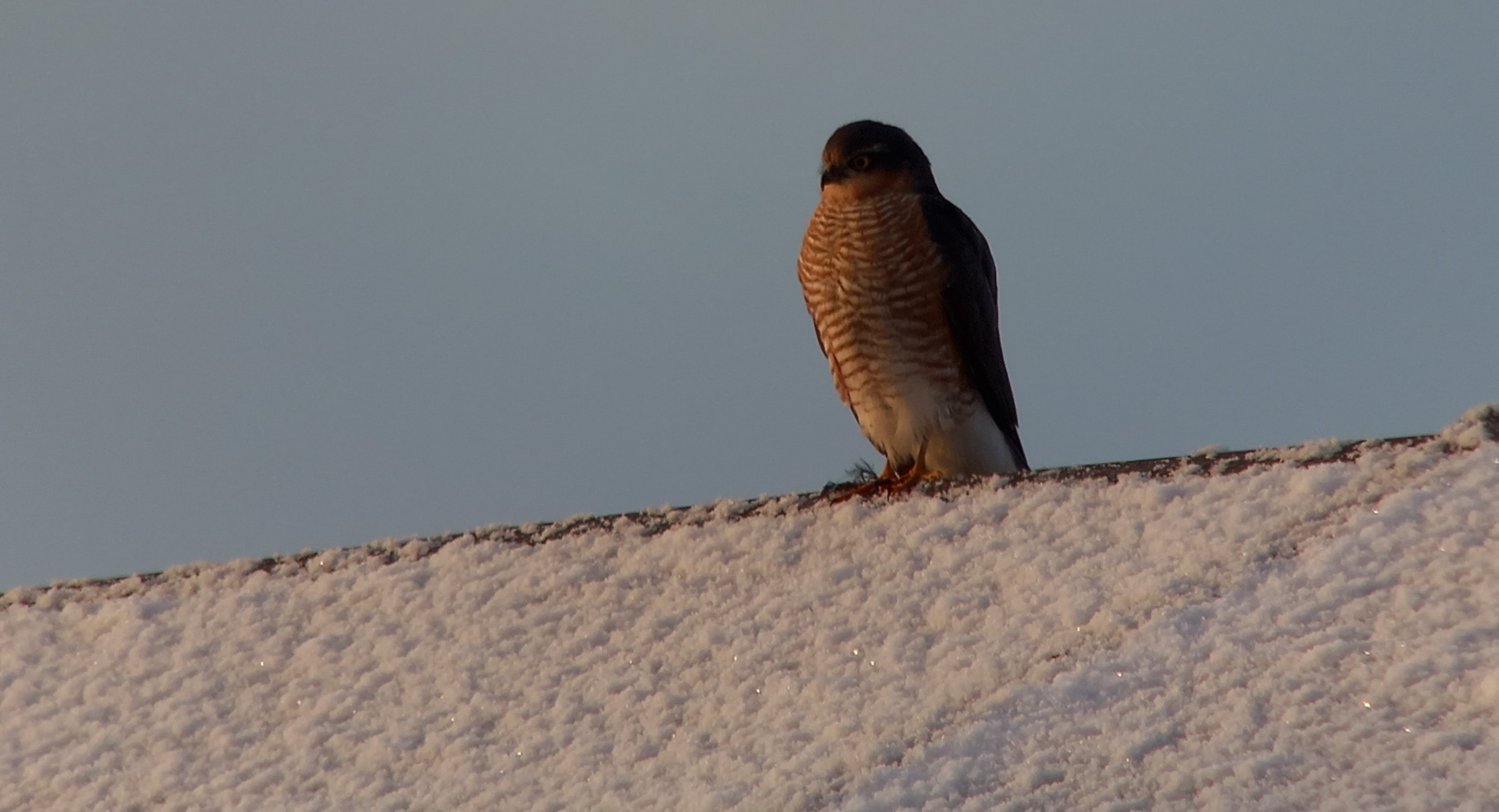 Op zondag 9 februari ben ik redelijk vroeg wakker. Vanuit bed hoor ik veel vogels roepen, er lijkt iets aan de hand te zijn, er is paniek. Normaal gesproken begint de dag met vogels die rustig aan het zingen zijn. De plaatselijke Koolmezen, Pimpelmezen, Spreeuwen, Boomklevers, Roodborst, Winterkoning etc., de standaard tuinvogels. Ook de eerste zingende Vink en Groenling kon ik afgelopen week alweer noteren. Maar vandaag begint de dag met paniek. Als ik voorzichtig de gordijnen open doe zie ik vogels alle kanten op vliegen. Huismussen hier, Huismussen daar, Merels druk alarmerend, een Pimpelmees die zich nog net niet te pletter vliegt tegen het raam. Kauwtjes die onrustig in de bomen fladderen. Al snel schiet een Sperwer over de plaatselijke voedertafel, waar alle dagen vogels in rust komen eten. De Sperwer gaat kortstondig in de plaatselijke berk zitten en vliegt weer door. Een bliksembezoek, dit keer komen de plaatselijke tuinvogels met de schrik vrij.