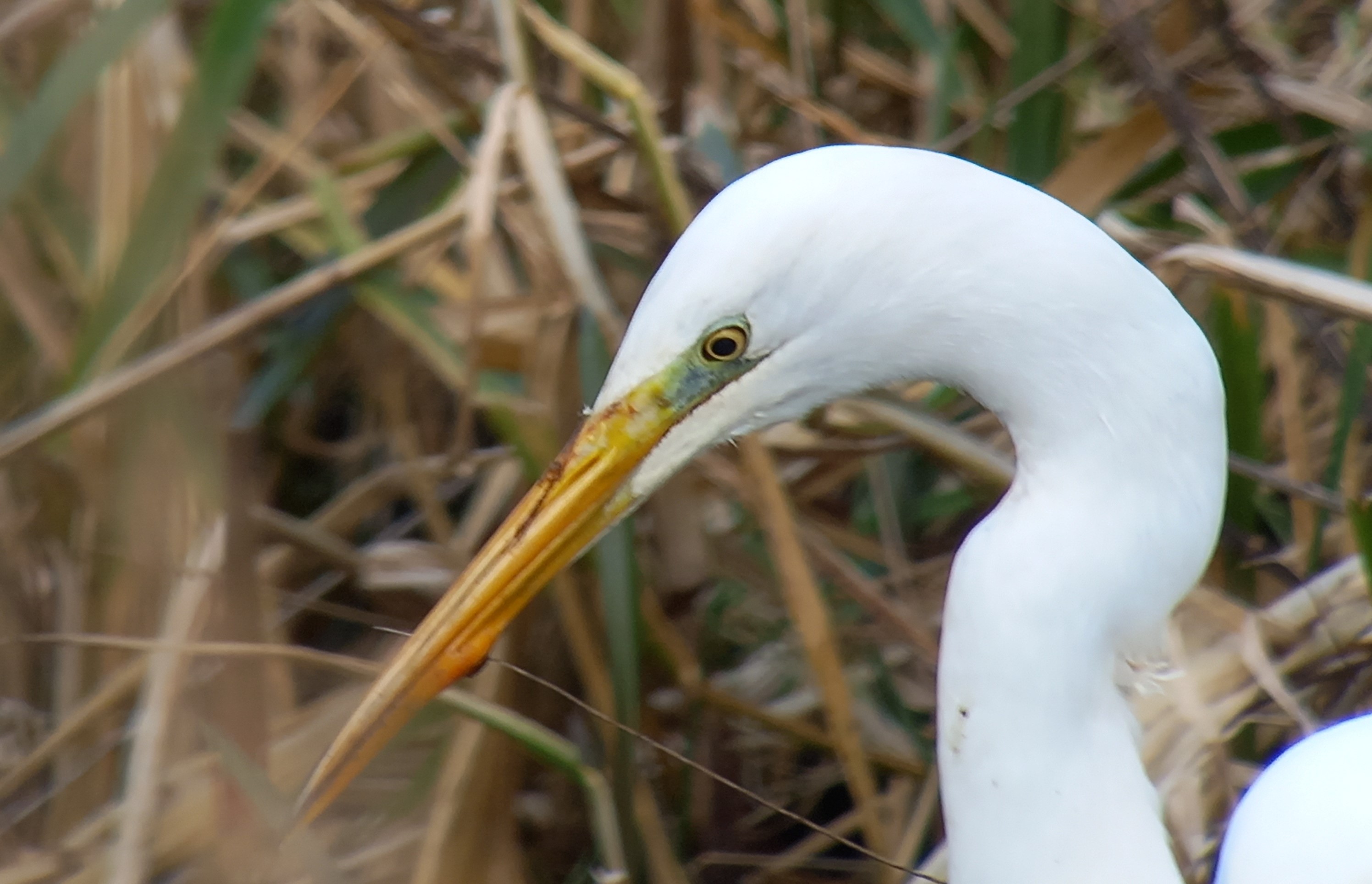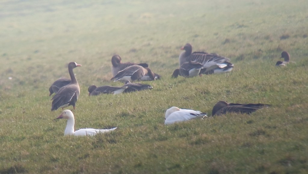 Vervolgens zoek ik de polders rondom het dorpje Rohel af, waar regelmatig 1 of meerdere Koereigers worden waargenomen. Ik zie een enkele Blauwe Reiger en overal waar ik kijk Grote Zilverreigers, maar geen ‘kleine witte reiger’. Dan maar snel richting de Sneeuwganzen, hopelijk zitten ze er nog. Vlak voor de locatie waar de vogels voor het laatst zijn gemeld zie ik al grote groepen ganzen, voornamelijk Kolganzen en Brandganzen. 2 witte Sneeuwganzen vallen wel op, zodat ik al na een minuut speuren kan concluderen dat de vogels hier niet tussen zitten. Even verderop zie ik een dijk, bij het dorpje Oldeouwer. Ik heb het vermoeden dat de Sneeuwganzen achter de dijk zitten, uit de noordoostelijke wind die inmiddels in kracht is toegenomen. Als ik op de dijk arriveer zie ik meteen 2 witte stipjes in de weilanden, het geluk is aan mijn zijde. Beide Sneeuwganzen zitten te slapen, met de kop in de veren, tussen de Grauwe Ganzen. Ik loop een stukje de dijk op en kan de vogels leuk bekijken. Op een gegeven moment vliegt een deel van de ganzen, inclusief de Sneeuwganzen, op door een Buizerd. Even later zitten de vogels er weer. Erg leuk om deze fraaie soort eens wat beter en langer te bekijken.