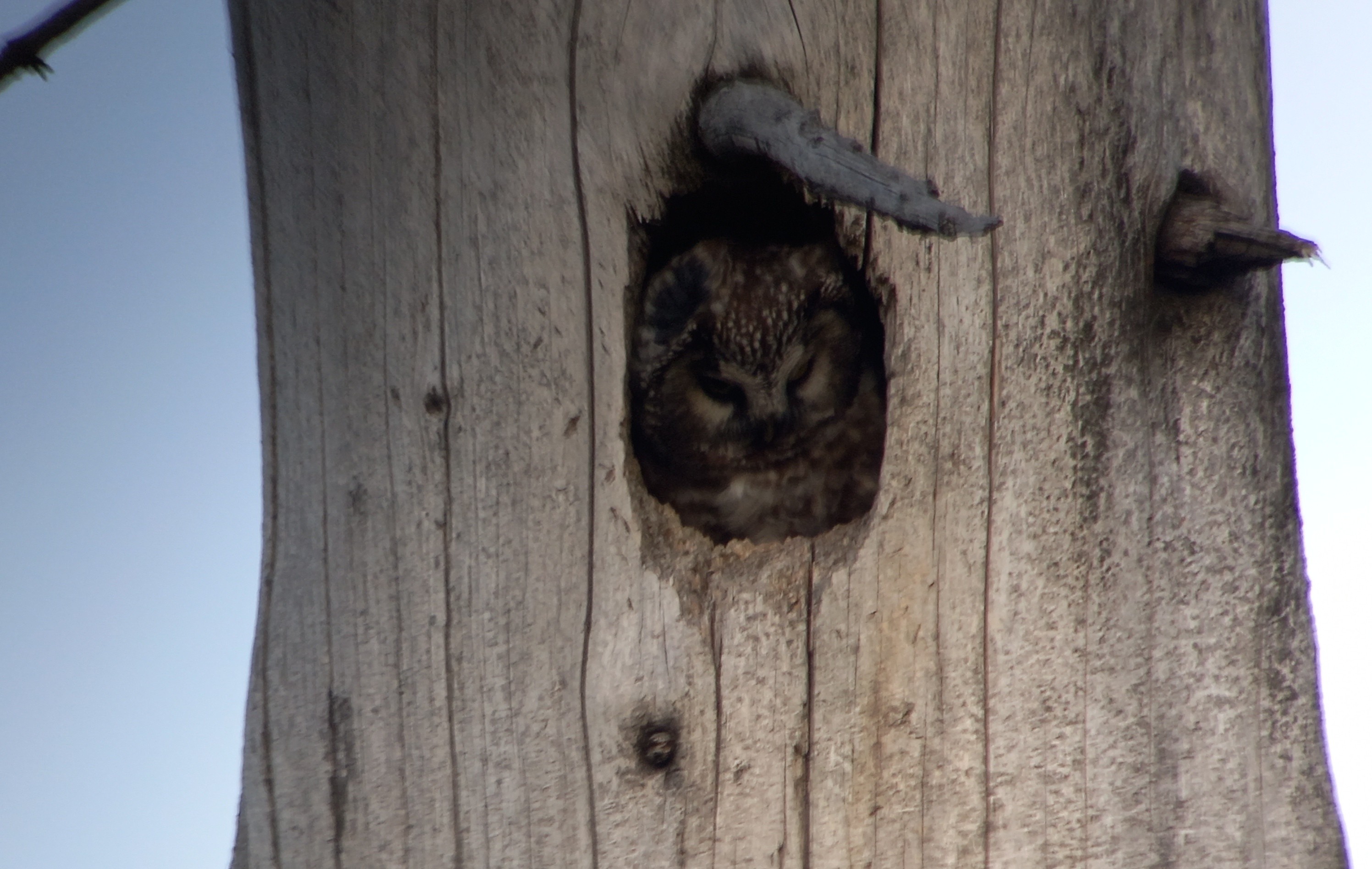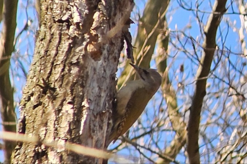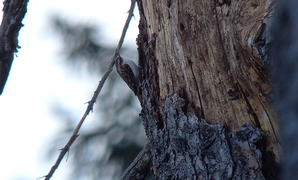 We maken ons een beetje zorgen om de harde wind, die veel sterker is dan we hadden verwacht. Niet bepaald ideaal tijdens het zoeken naar uilen. Zullen ze überhaupt actief zijn? De twijfel slaat toe. Aan de andere kant, geven de vele actieve zangvogels ons hoop. Dan ziet Jeroen links van het wandelpad het hol van waarschijnlijk een Zwarte Specht. We kunnen onze ogen nauwelijks geloven als we een uitstekende uilenkop zien verschijnen vanuit het hol. Merel weet nog net de woorden “Dwerguil” uit te brengen, maar het blijkt warempel een Ruigpootuil! Heel onwerkelijk. Deze zagen we even niet aankomen, hoewel we wisten dat de soort in dit gebied leeft/broedt. En zo staan we zomaar oog in oog met een Ruigpootuil, schitterende en magische vogel. De avond ervoor bezorgde een zingende Ruigpootuil ons al kippenvel, dit is nog intenser. Mijn hart bonkt in mijn keel, ik moet 2 keer in mijn ogen wrijven, is dit geen droom? Nee, het is een droomwaarneming. Na een kleine show trekt de uil zich terug in de boom. We staan nog steeds te ‘trillen’ van wat we zojuist zagen, een ontmoeting om nooit meer te vergeten. Ook een Kortsnavelboomkruiper laat zich mooi bekijken.