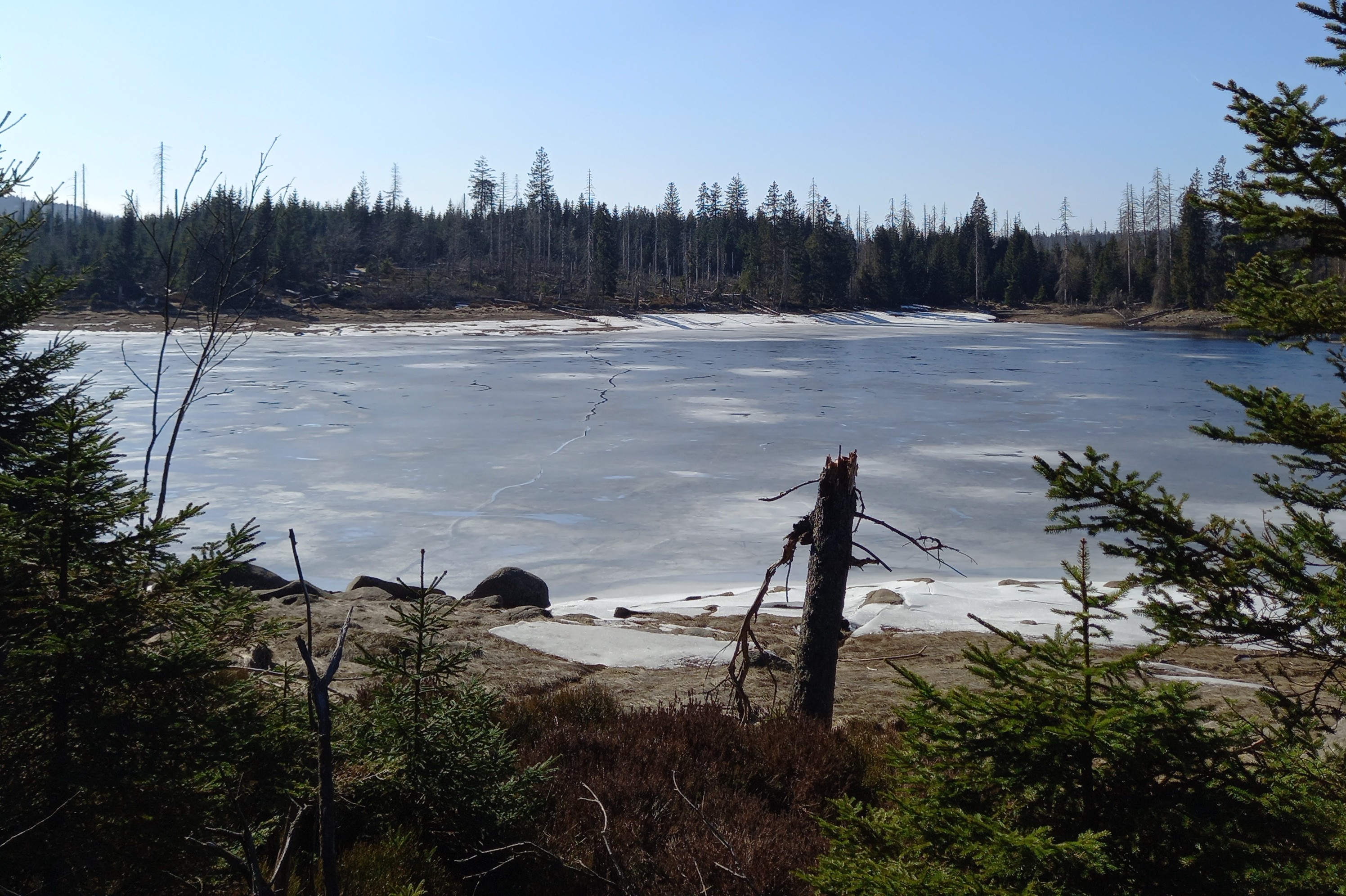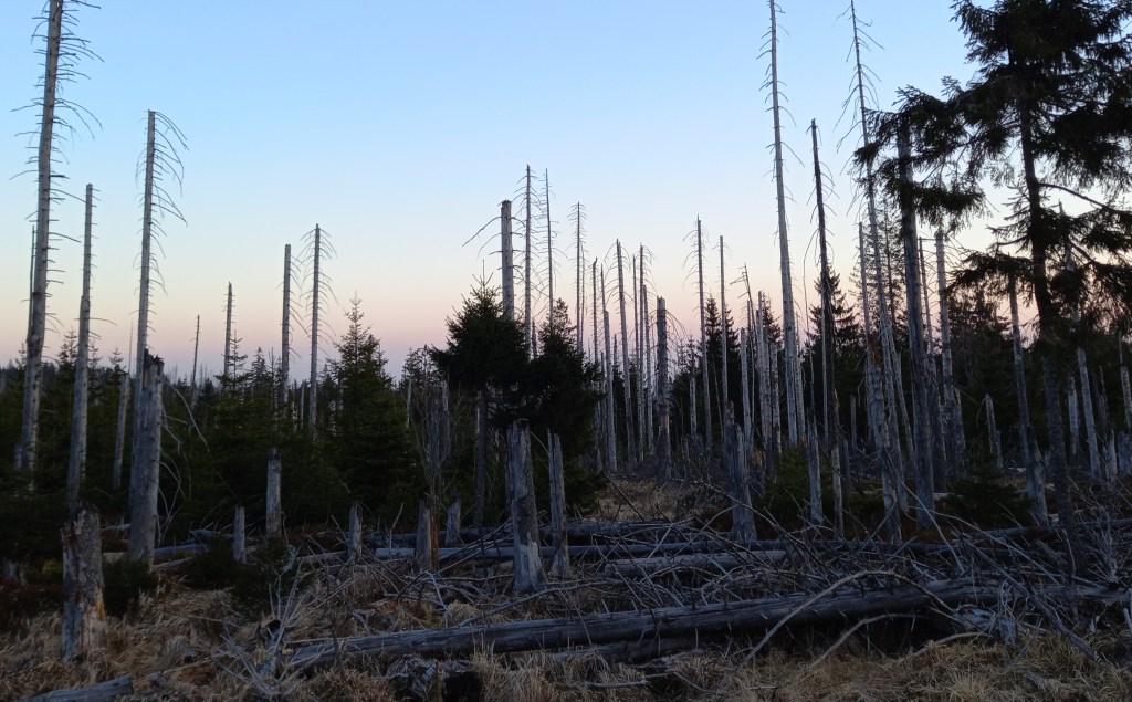 13:00 parkeren we onze auto in de Harz, nu begint ons avontuur echt. Een Zwarte Mees zingt ons tegemoet, Grote Gele Kwikstaart overvliegend. Bij de ingang van een wandelpad zingt een Vuurgoudhaan. Het wandelpad leidt ons naar de Oderteich, een prachtig meertje. Wat opvalt is de structuur van de bomen, het beeld van het boslandschap. De uitgestrekte sparrenbossen ademen een terneergeslagen sfeer uit. Afstervende sparren afgewisseld met open en kale vlaktes. Sommige dode bomen hangen over het pad. Wellicht het gevolg van klimaatverandering, droogte en de Letterzetter. Een wijd verspreide keversoort die onder meer fijnsparren aantast. Op plekken waar bomen afsterven ontstaat weer nieuw leven. Piepjonge sparretjes, struikhei, kraaihei, grassen, mossen, korstmossen. Dood wordt afgewisseld met leven. Warmteminnende dieren zoals insecten en reptielen profiteren van de open plekken, waar de zon vrij spel heeft. Ook profiteren veel organismen van het grote aandeel dood hout, zoals spechten, kevers, paddenstoelen. Zelfs de dood kent schoonheid, je moet het soms even willen zien.