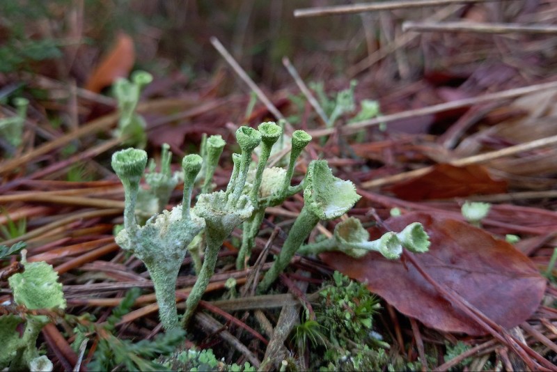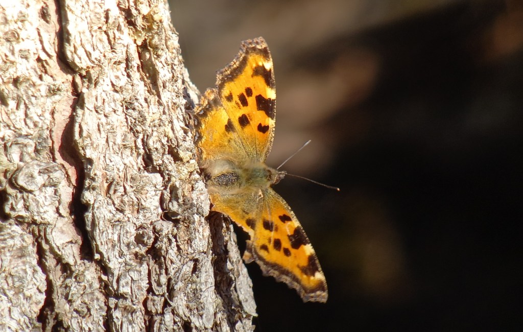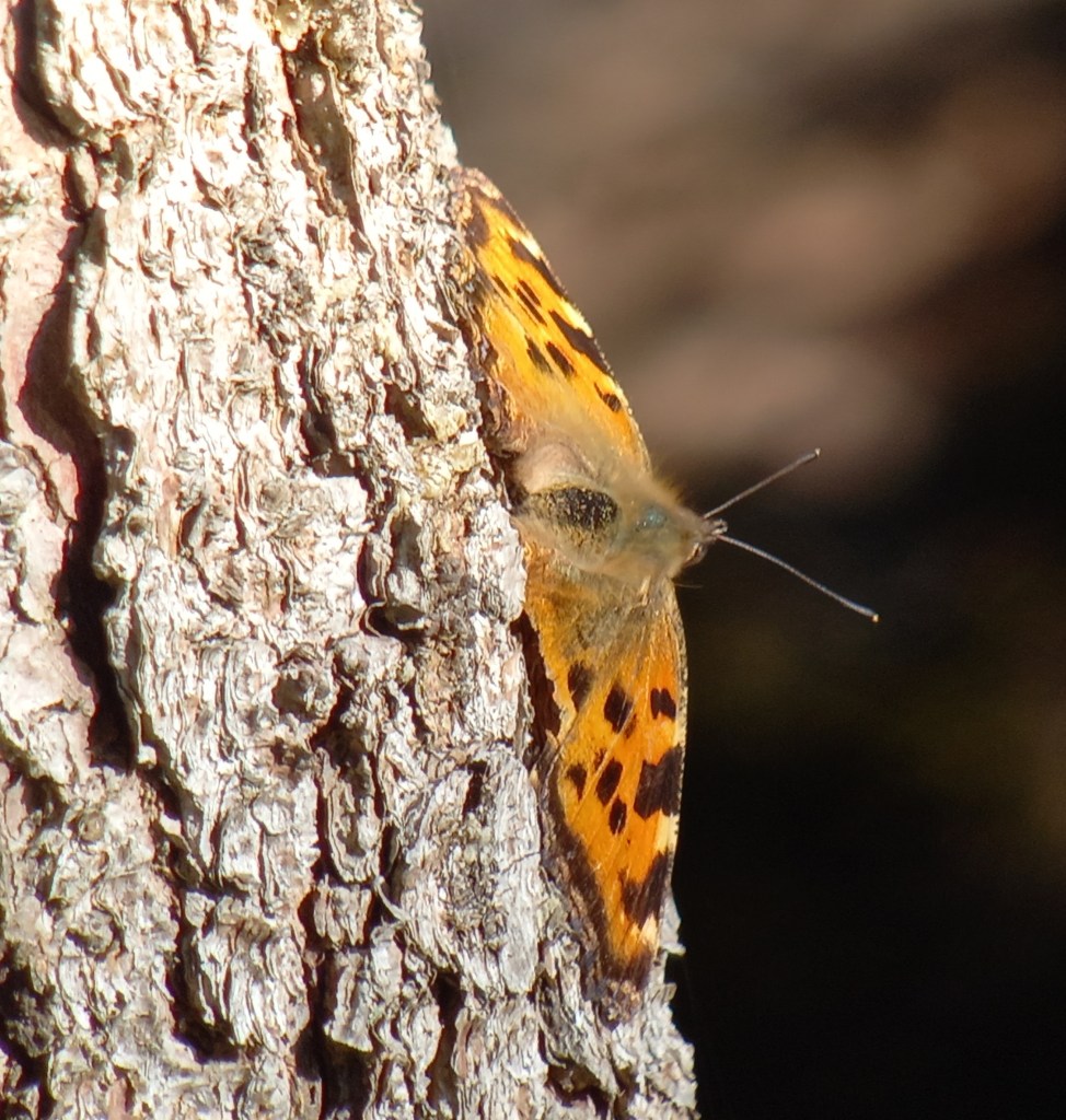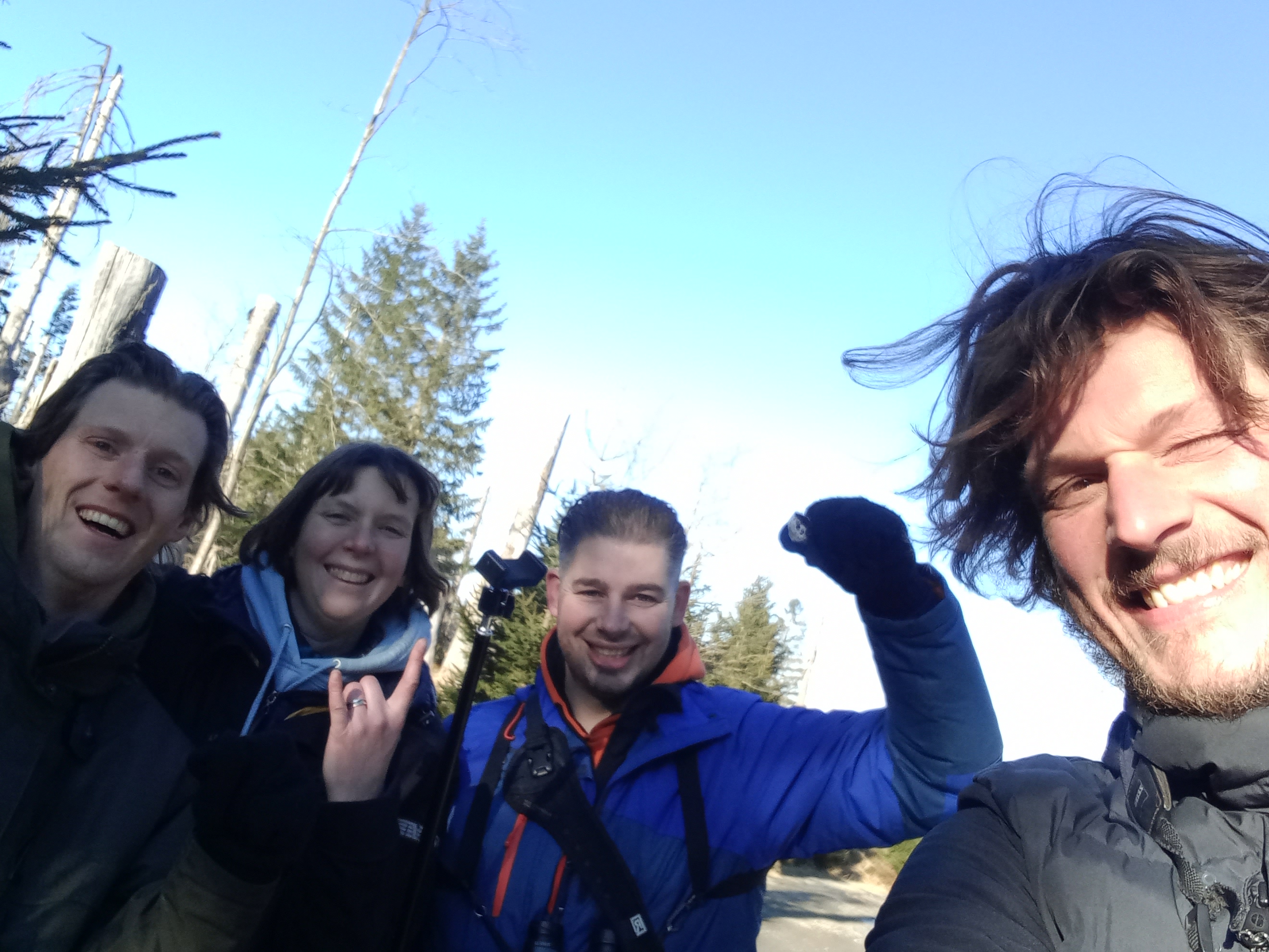 We zijn de auto nog niet uit als we een lacherig ‘klu-klu-klu’ geluid horen dat meteen doet denken aan Grijskopspecht. Zelf twijfel ik nog even aan Groene Specht, mogelijk wordt het geluid vervormd door het ruisen van de wind. Het geluid lijkt dan toch van dichtbij te komen en klinkt wel erg goed voor een Grijskopspecht, dus lopen we gauw de eerste helling op. Dan zien we een specht vliegen die landt in een boom. Folkert Jan krijgt de vogel goed in beeld en het blijkt inderdaad een Grijskopspecht. Merel en Jeroen zien de vogel ook, maar zelf moet ik nog even goed zoeken. In een ‘vorkvormige’ boom, met de zijkant naar ons toe, bij dat ene zijtakje. Er zijn meer ‘vorkvormige’ bomen. Gelukkig duurt het niet lang of ik heb de vogel ook mooi in beeld. Wederom een enorme gelukstreffer, het blijkt zelfs om 2 vogels te gaan. 1 vogel kunnen we langdurig mooi bekijken, omdat deze ‘vastgeplakt’ zit aan de boomstam van diezelfde vork-boom.