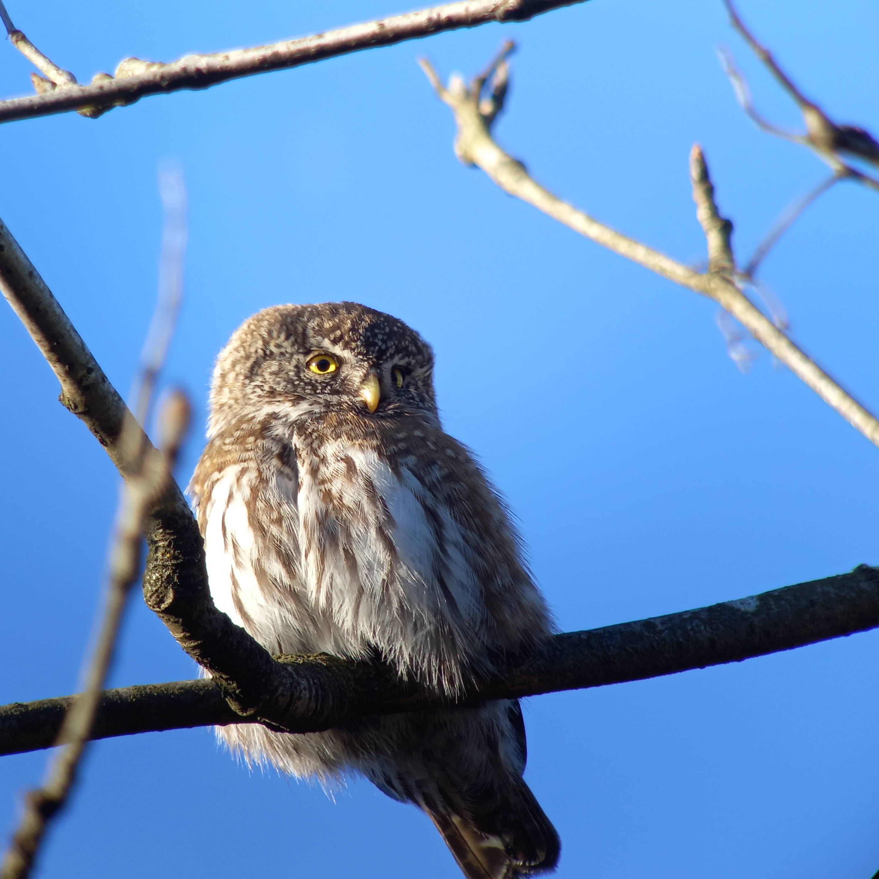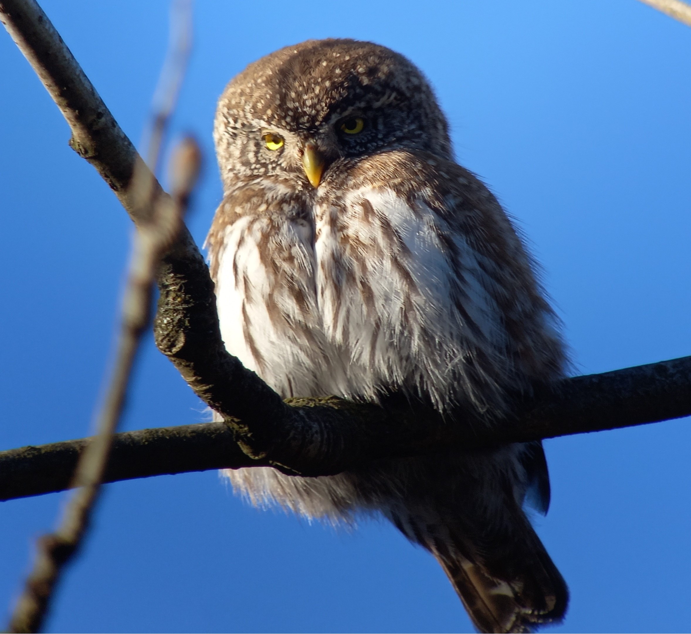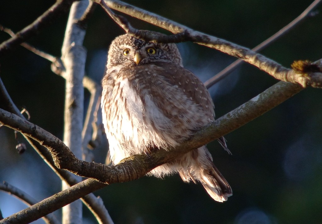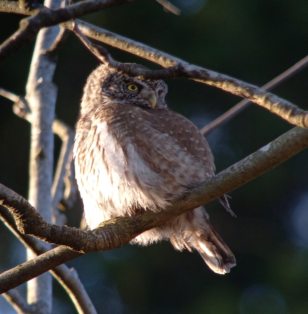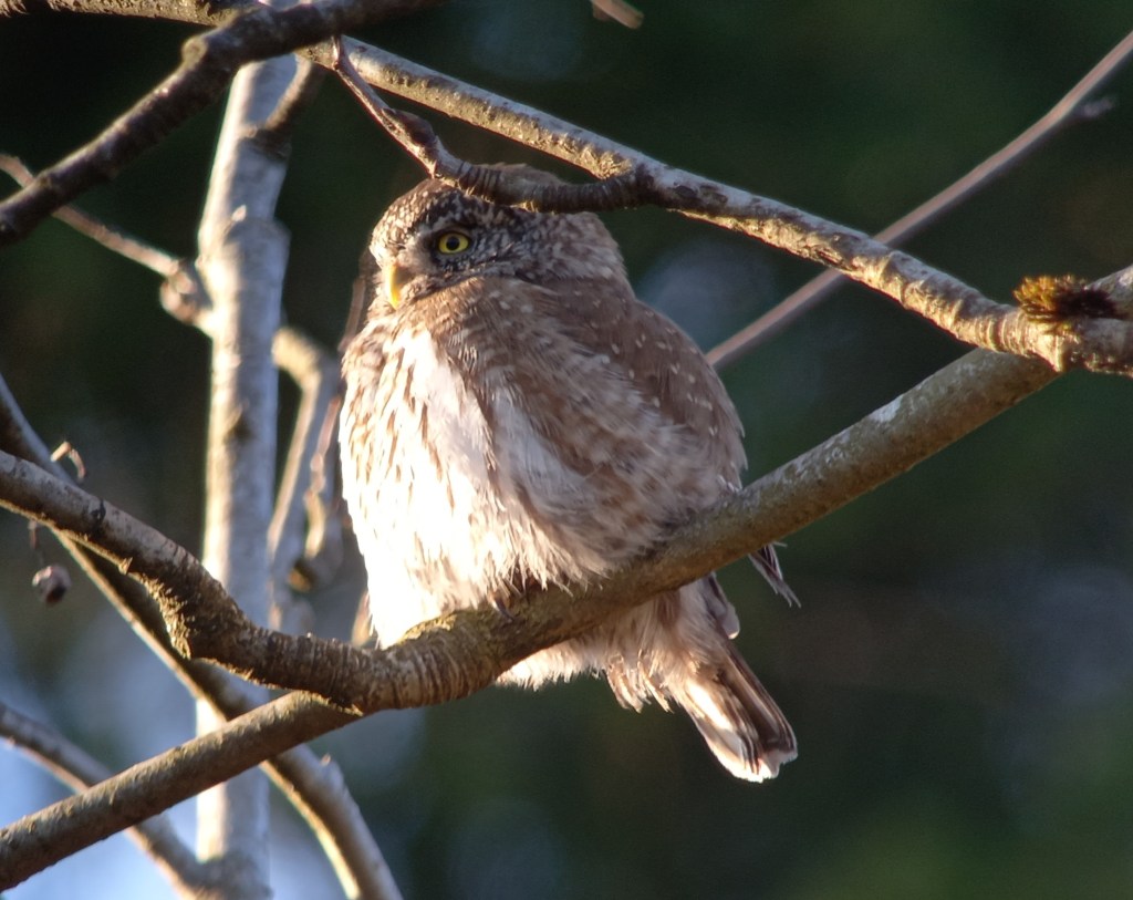 Nog nauwelijks ‘bekomen’ van de Ruigpootuil, horen we achter ons een luide fluittoon. Enigszins herinnerend aan Goudvink, Dwerguil! Wordt het zo’n geluksdag? Dat kon toch niet waar zijn? We lopen richting het geluid, maar zien in eerste instantie niks. Wellicht zit de Dwerguil ergens tussen de dichte begroeiing van (nog gezonde) naaldbomen. We zoeken, kijken, het uiltje lijkt niet ver van ons verwijderd. Een zingende Grote Lijster overstemd het ruisen van de wind die in kracht lijkt toe te nemen. De Dwerguil is inmiddels stil. Als we weer een stukje het pad teruglopen horen we opeens de Dwerguil weer, dat klinkt wel heel dichtbij. En dan weer zo’n onwerkelijk moment, een Dwerguil zittend op de zijtak van een eik, op enkele meters afstand. De vogel trekt zich vrijwel niks aan van onze aanwezigheid. Ruim een halfuur kunnen we genieten van dit minuscule uiltje. De kleinste Europese uil ter grootte van een Spreeuw laat zich van alle kanten schitterend observeren.