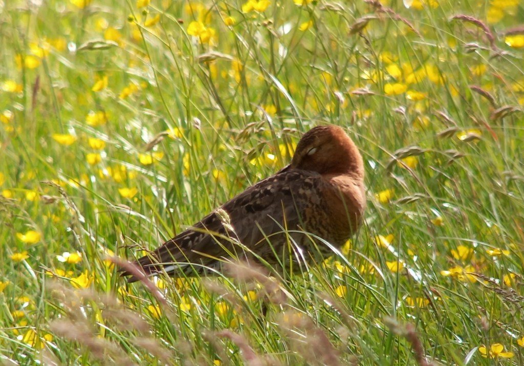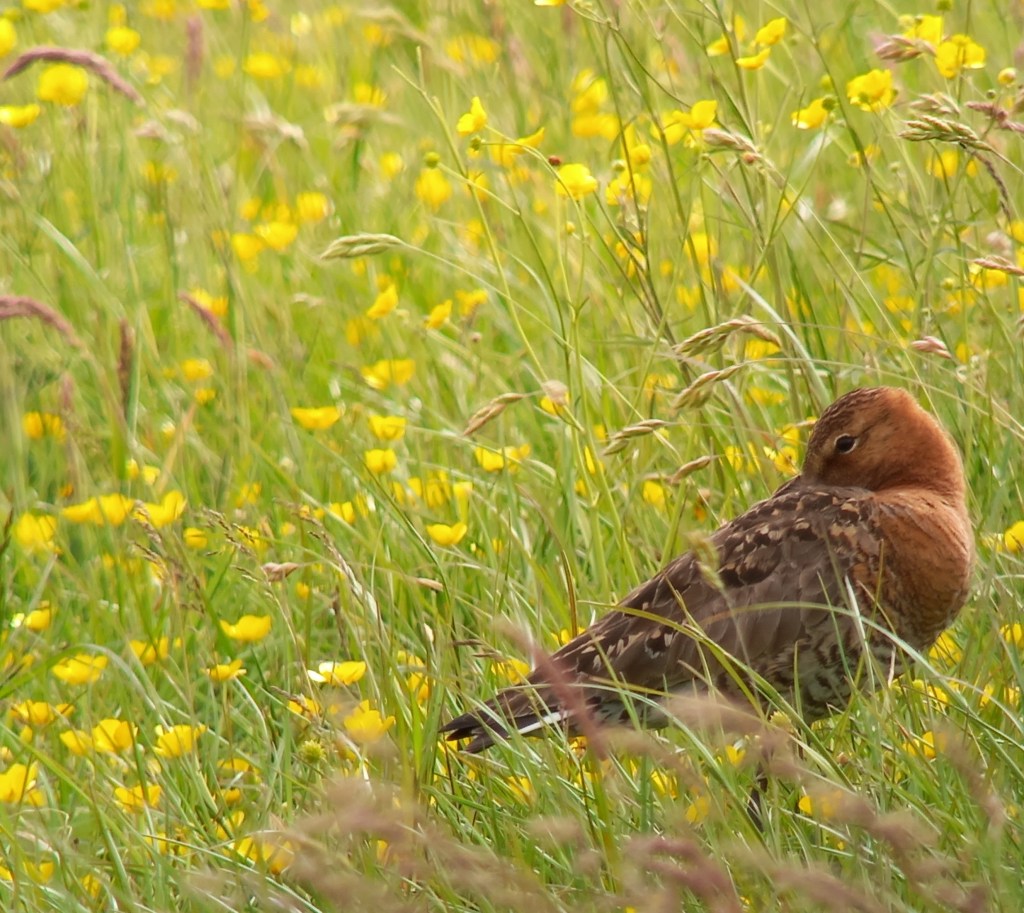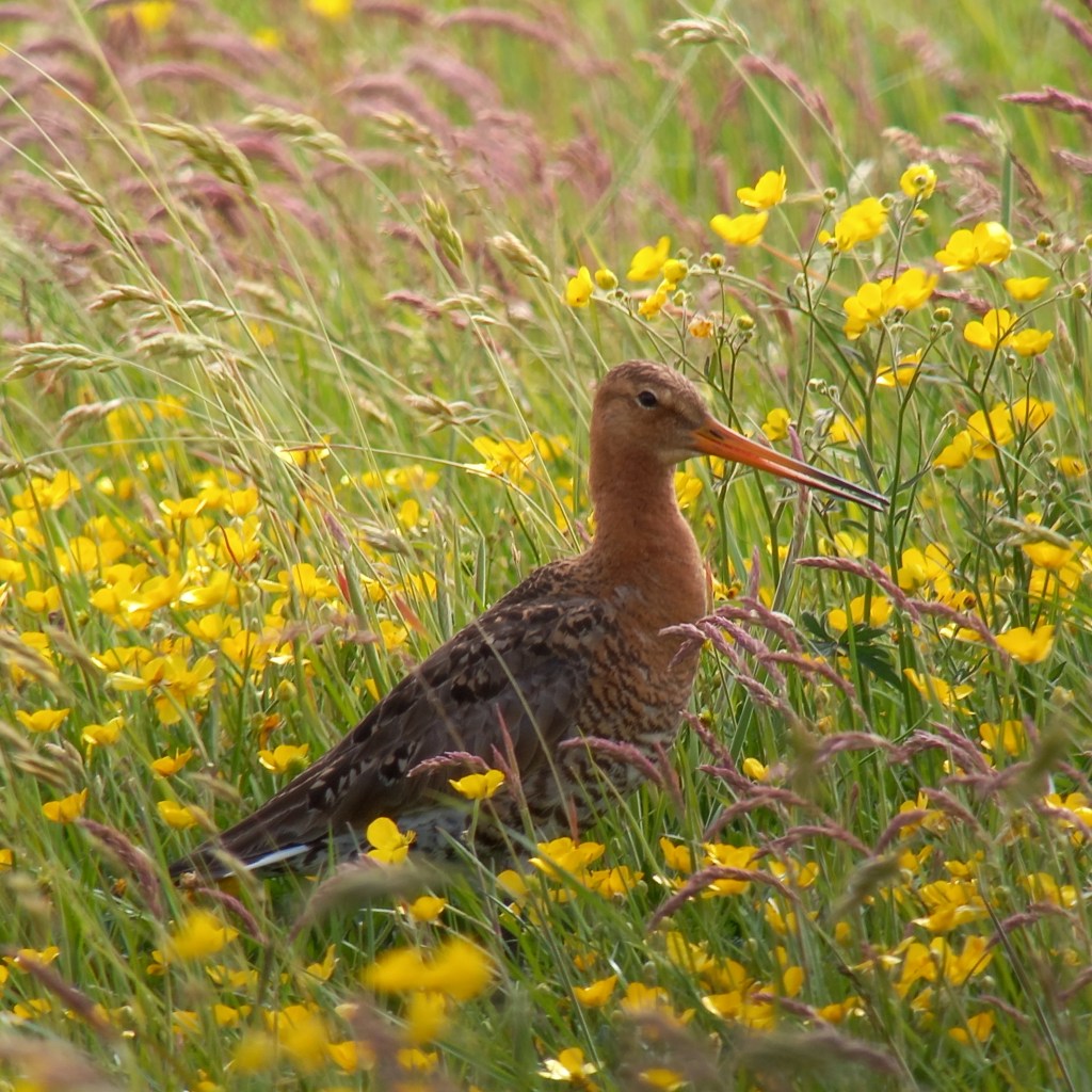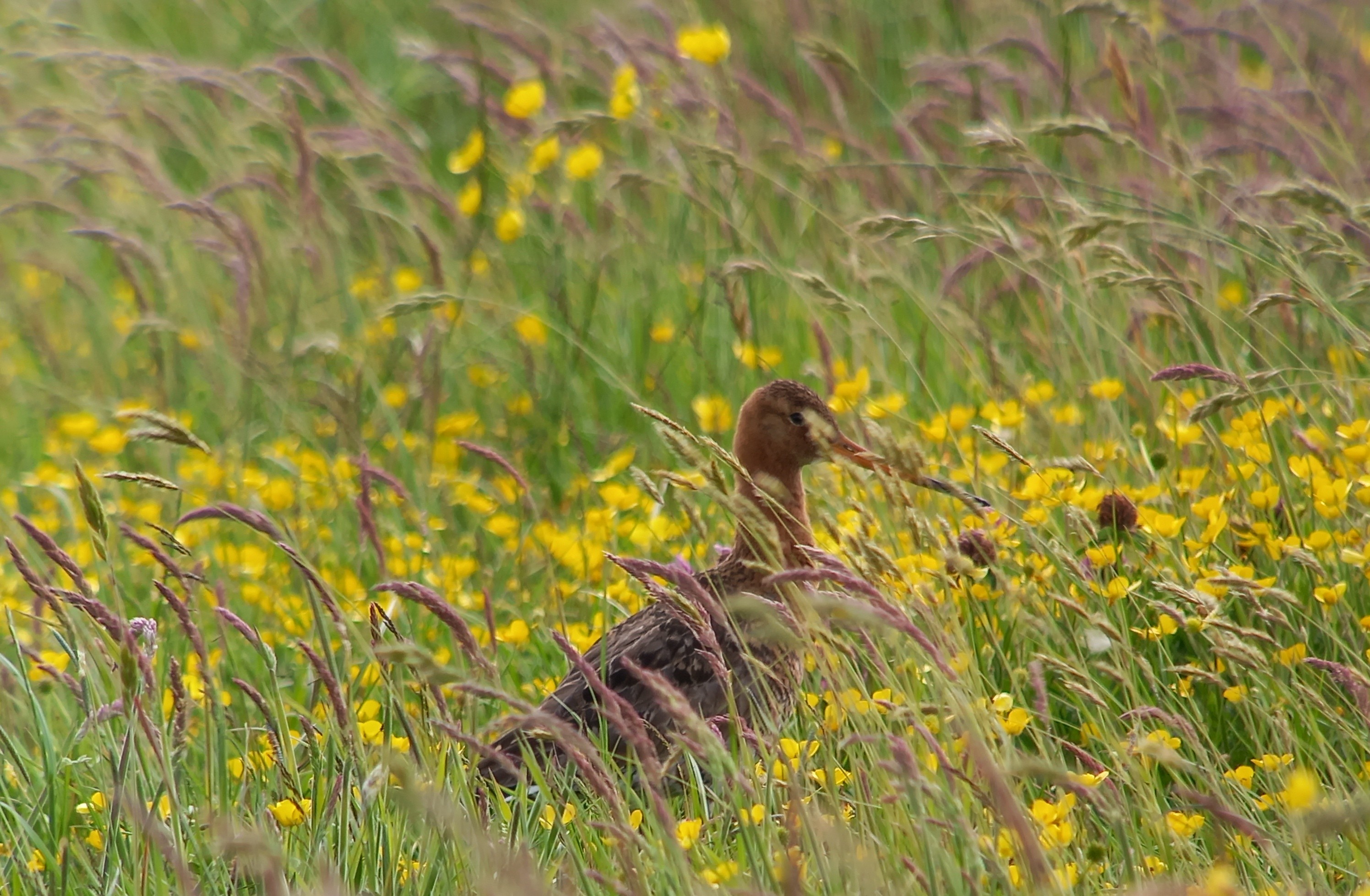 Tijdens een lange fietstocht op woensdag de 21e, kan ik het niet laten om hier weer een kijkje te nemen. Vanaf Woudsend fiets ik via Heeg en Oudega naar Ripera. De plantenpracht hier alleen al is het stilstaan waard, om van te genieten. Het is fantastisch hoeveel soorten kruiden en grassen kunnen gedijen bij minder intensief en meer natuurvriendelijk boeren. En de aantrekkingskracht van de bloemen op insecten. Maar het zijn natuurlijk de vogels die echt de show stelen in dit landschap. Op een paaltje vlak langs het fietspad staat parmantig een tureluur. De lange felrode poten staan in diep contrast met het bruine houtige paaltje. Het kenmerkende ‘tu-re-luur’ geluid lijkt overal vandaan te komen. Hoeveel paartjes zullen er broeden? De tureluur vliegt op, maakt een korte alarmvlucht en strijkt neer in het kruidenrijke grasland. Onvindbaar. Een paartje grutto’s belagen twee zwarte kraaien in het luchtruim. Een snelle blik in de directe omgeving toont aan dat er aardig wat paartjes grutto’s nestelen.