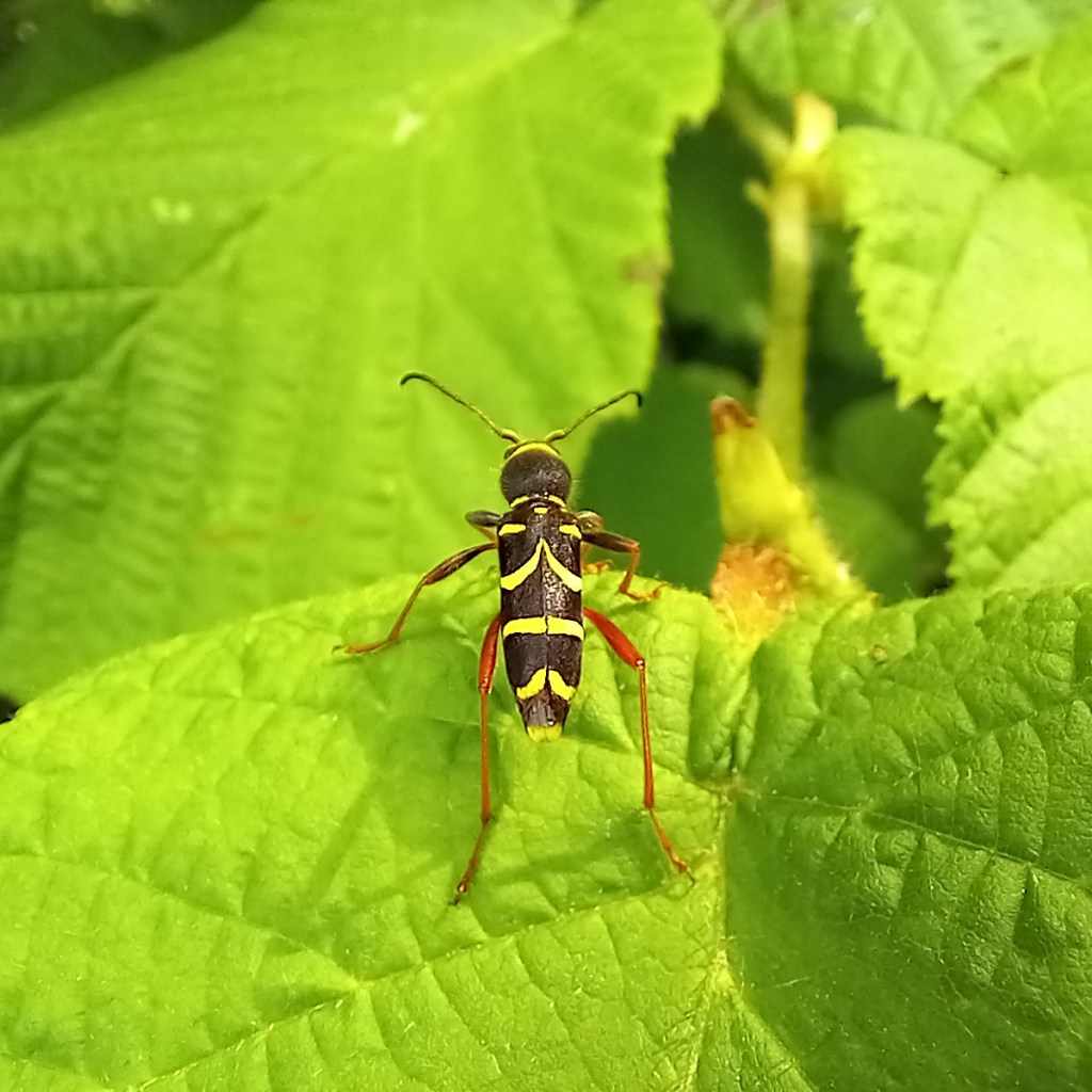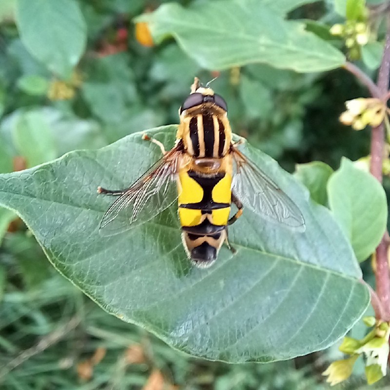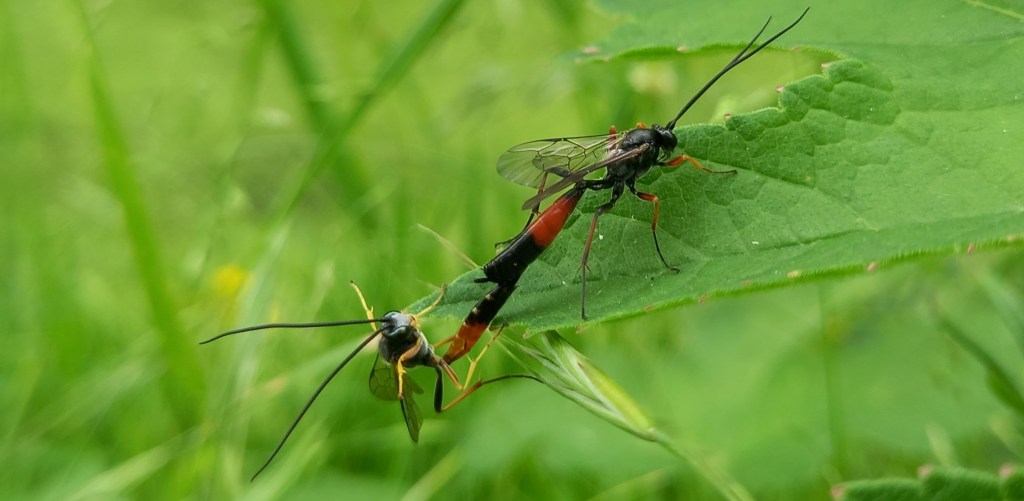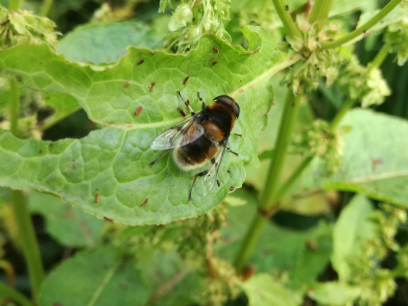 Na afloop van de excursies maak ik weer een rondje door het bos met Jeroen. Door het niet te koude en niet te warme weer, zijn er veel insecten actief. Alleen de wantsen vallen wat tegen. Fraaie en sierlijke zweefvliegen zijn er in de vorm van hommelbijvlieg, moeraszweefvlieg, citroenpendelvlieg en snorzweefvlieg. Overal in het bos schuimcicades en bloedcicades. Van die beestjes die eigenlijk overal zijn, maar waar je makkelijk aan voorbij loopt. Op verschillende plekken zien we sluipwespen.