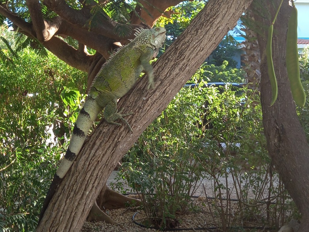 Bij aankomst op het vakantiecomplex zien we de eerste naaktoogduif, één van de algemeenste vogelsoorten op Bonaire. Tijdens het uitpakken van onze spullen in het appartement een tropische spotlijster in de voortuin, ook een algemene soort. Tropische spotlijster zou je de merel van Bonaire kunnen noemen. Even later ziet Nico de eerste groene leguaan, rustig klauterend in een boom voor het appartement. Eindelijk mijn eerste (natuurlijke) ontmoeting met dit prehistorisch uitziende dier. Op mijn 15e wou ik één als huisdier, gelukkig is het er nooit van gekomen. Zo’n hagedis van 1,5 tot 2 meter lang is toch het allermooiste in zijn natuurlijke habitat. In dit geval in de tuin van een vakantiecomplex met voldoende voedsel, zonplekken en bomen om in te klauteren. Groene leguanen brengen het grootste deel van hun leven door in bomen. En zo staan de eerste wenssoorten van onze vakantie al op ons netvlies gebrand.