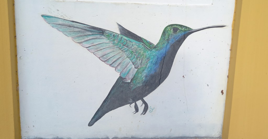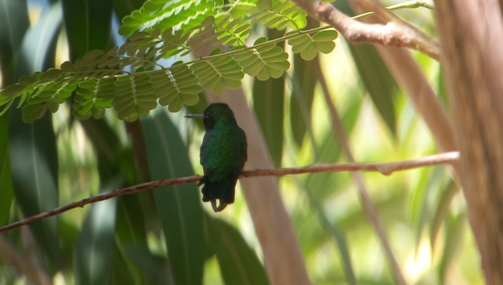 Vlak voor het avondeten kan ik het niet laten nog even langs de vele bloemen rondom het appartement te speuren, in de hoop een kolibrie te zien. Het duurt niet lang of ik zie al een klein blauwgroen vogeltje snel heen en weer fladderen tussen paarse bloemen. Een euforisch gevoel overvalt me, het voelt als een droom. Snel roep ik Nico erbij. Verderop een tweede exemplaar. Onmiskenbaar één van de twee soorten kolibries die broeden op Bonaire, en hier jaarrond zijn te bewonderen; de blauwstaartsmaragdkolibrie. De naam is net zo mooi als het vogeltje. De andere soort is de muskietkolibrie.