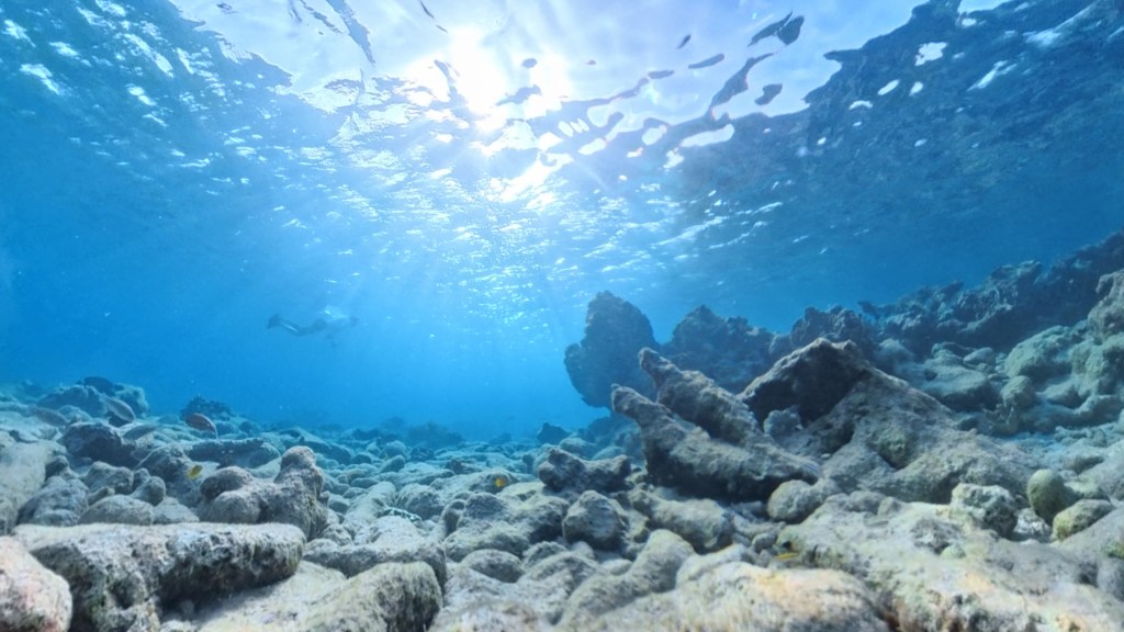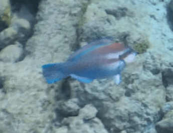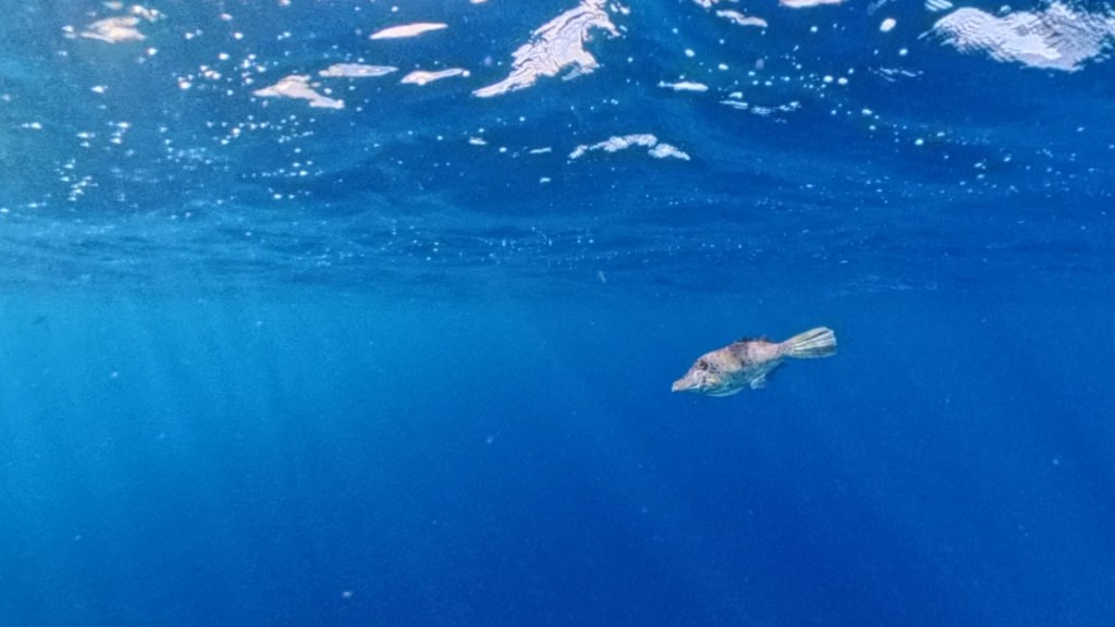 Terwijl we ons maar blijven verwonderen over de koraalriffen, de soortenrijkdom en habitats, zwemmen we ongemerkt het diepe in. We gaan helemaal op in de onderwaterwereld, laten ons meeslepen. Op een gegeven moment ben ik Nico uit het oog verloren, maar een korte blik boven water laat zien dat Nico een stukje is opgeschoven richting het noorden. Zelf dwaal ik af naar grote diepte, als ik naar beneden kijk zie ik hoe de koraalriffen vervagen in een donkerblauwe wereld. Ik zie steeds minder vissen en de vissen die ik zie, zwemmen aan het wateroppervlak. Al fantaserend over zeeschildpadden, die we nog steeds niet hebben gezien, dwaal ik nog verder af.