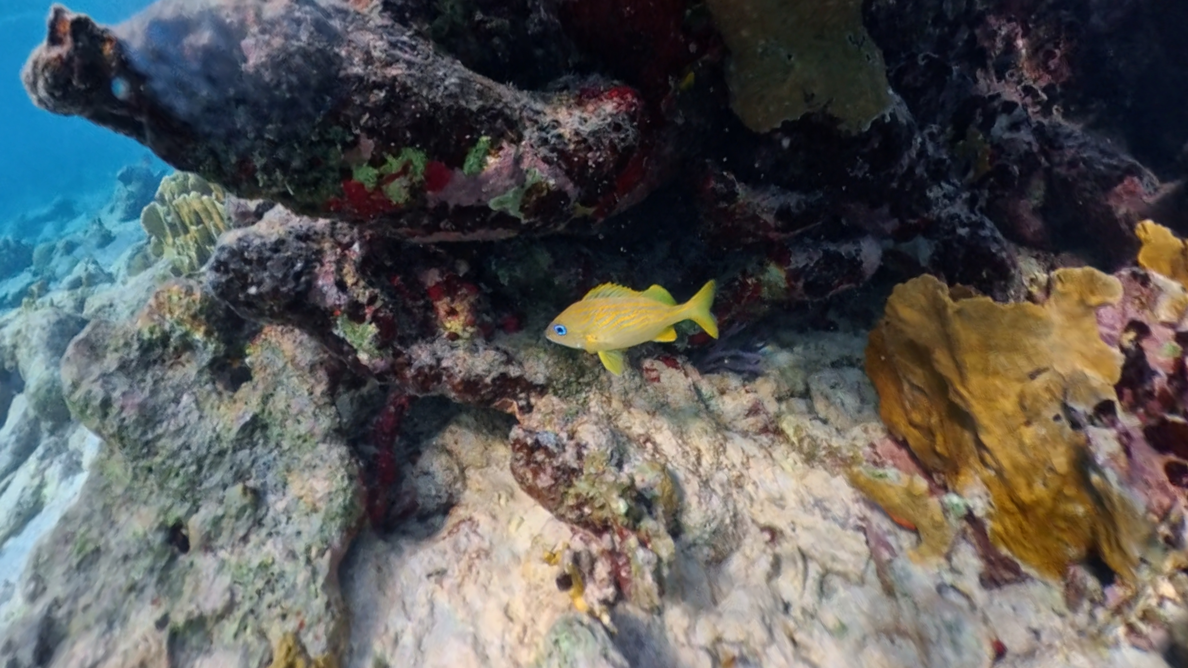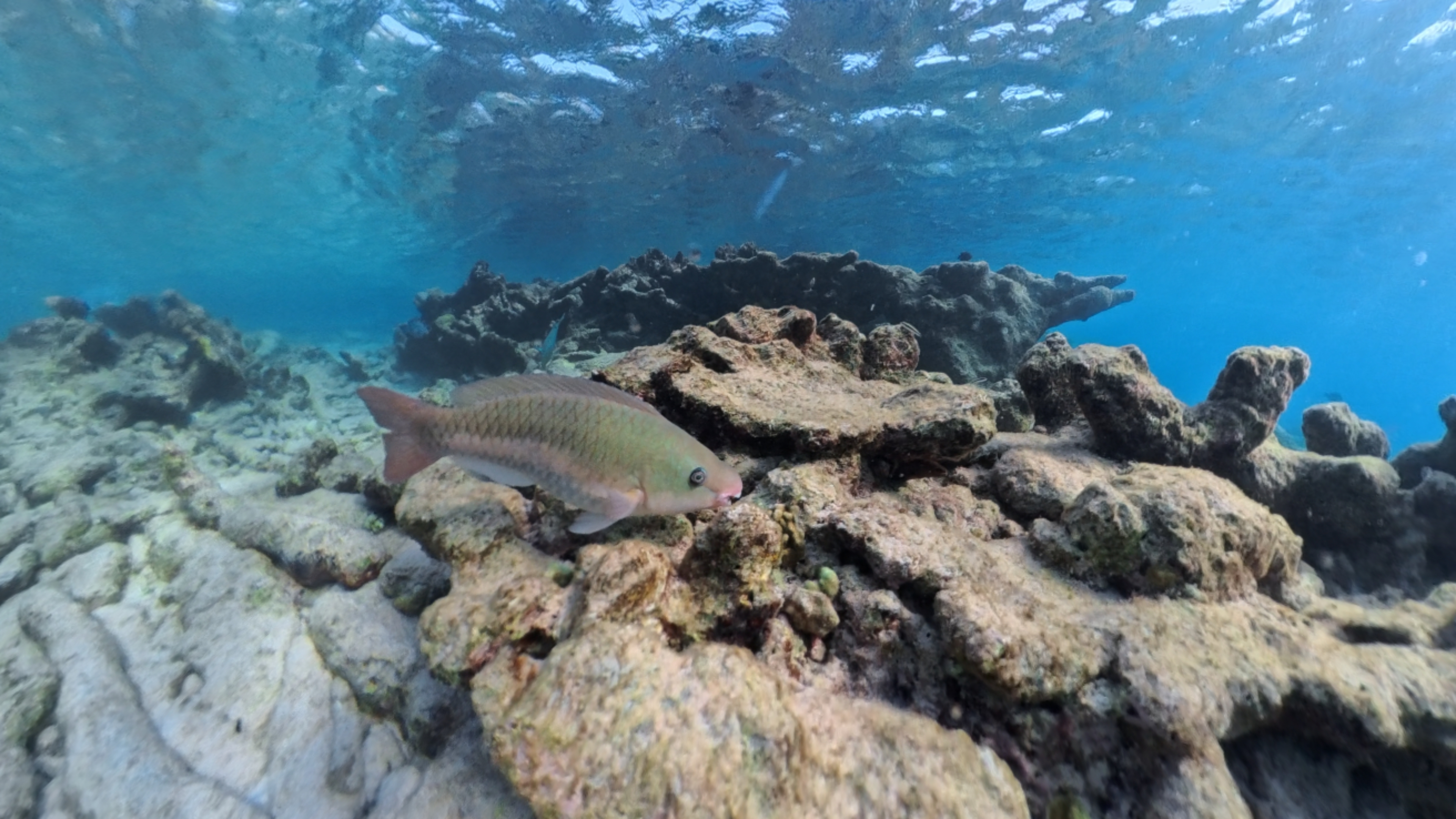 Nadat ik Nico op de hoogte heb gebracht van Andrea II, fietsen we snel die kant op. Verwelkomd door een groene leguaan en honderden renhagedissen die ook hier overal weg schieten, parkeren we onze fietsen en lopen langzaam de zee in. Ook hier huist een grote populatie zee-egels, oppassen weer. Ondanks dat Andrea II slechts drie kilometer is verwijderd van Oil Slick Leap, ziet de onderwaterwereld er hier toch heel anders uit. Het valt vrij snel op dat hier meer soorten vissen rondzwemmen dan verderop.