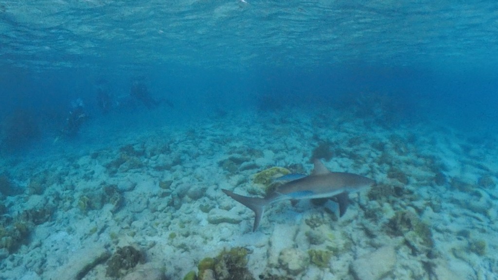 Het voelt toch prettig om weer dichtbij de kust te zijn, waar ook andere mensen snorkelen/duiken. Ik tref ook weer Nico, die met zijn onderwatercamera mooie opnames maakt van al het leven. Terwijl ik weer koraal bekijk, zie ik vanuit mijn ooghoek iets groots zwemmen, als het ware achter ons langs. Hoewel ik het haast niet kan geloven, zie ik meteen dat het een haai is en maak wilde gebaren naar Nico. Gelukkig is Nico dichtbij en ziet de haai ook meteen. We zwemmen erachteraan maar de haai verdwijnt al snel uit zicht. Een kort maar krachtige waarneming, we hebben een haai gezien! Na het bekijken van de opnames komen we tot de conclusie dat het een Caribische rifhaai is geweest. Een vrij algemene soort langs de kust van Bonaire. Later komen we erachter dat Andrea II één van de betere plekken is om deze soort te zien. Caribische rifhaai is ongevaarlijk en leeft deels van koraalvissen. Met een lengte van 2,5 tot 3 meter is het een middelgrote haai. Weer een ervaring rijker.