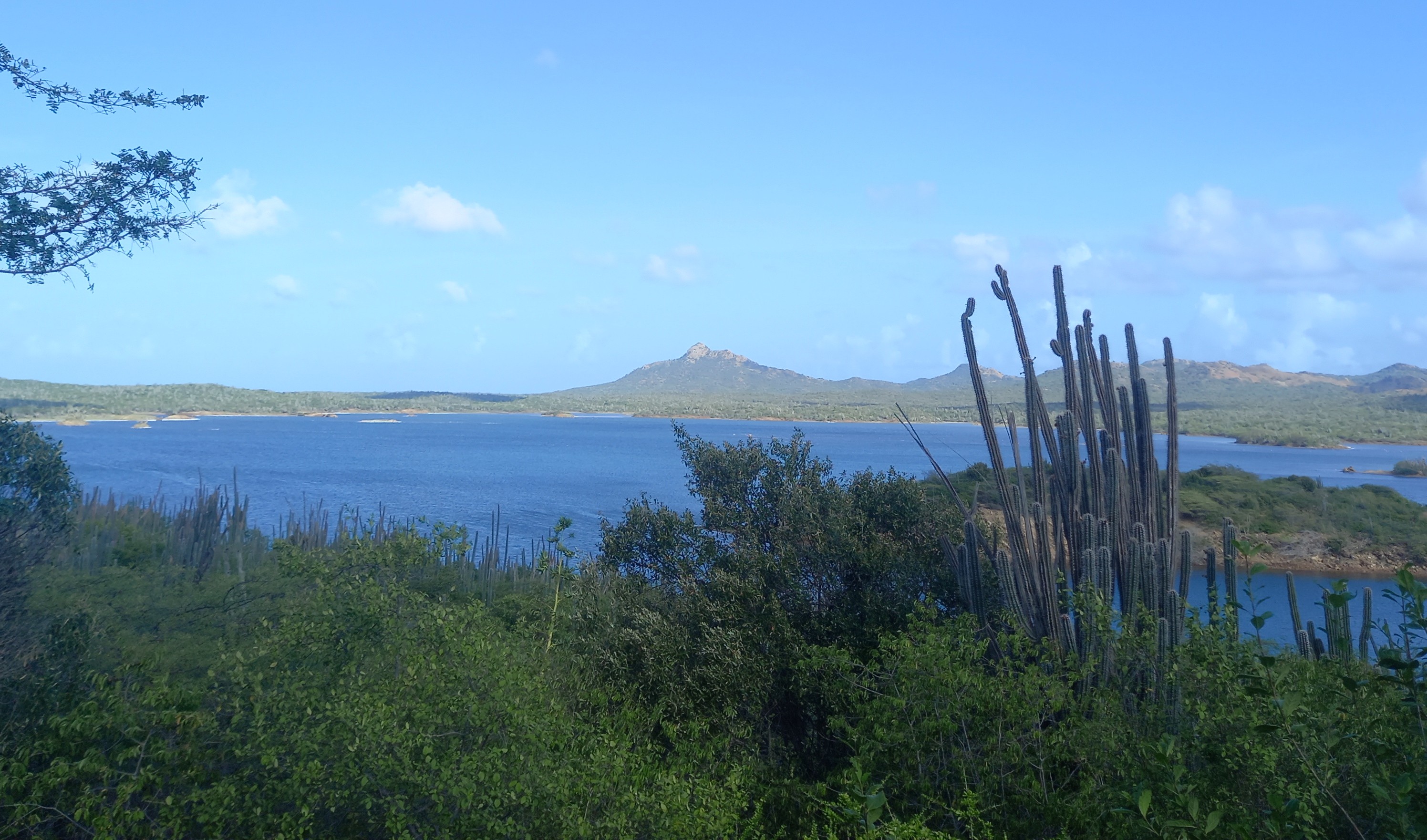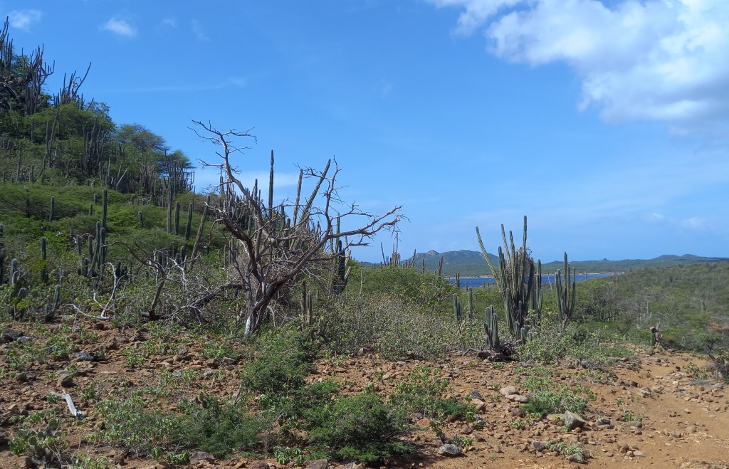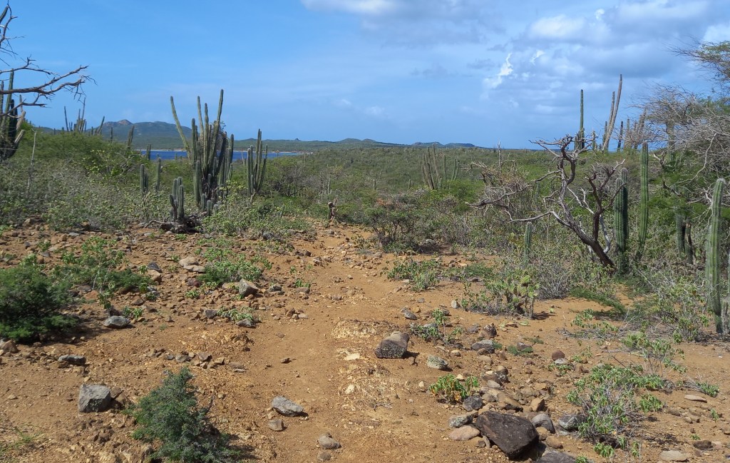 Vanaf het Echo Dos Pos Conservation Centre lopen we via een wandelroute omhoog. Aanvankelijk is het prima te doen, omdat we in de schaduw van bomen en struiken lopen. Maar hoe verder we doorlopen hoe warmer het wordt. Het is inmiddels rond 10:30 en behoorlijk heet, het is weer een beetje afzien. Echter, we hebben wel gekozen voor de korte route i.p.v. lange route. En het zal niet lang duren voor we weer in de schaduw lopen. Op enkele honderden hagedissen na, is er vrij weinig te zien langs de wandelroute. Vogels zitten vooral in de lager gelegen gebieden, in de luwte. Langs de route is het vooral genieten van het woestijnlandschap, en het uitzicht over het Gotomeer, met op de achtergrond de hoogste berg van Bonaire, de Brandaris.