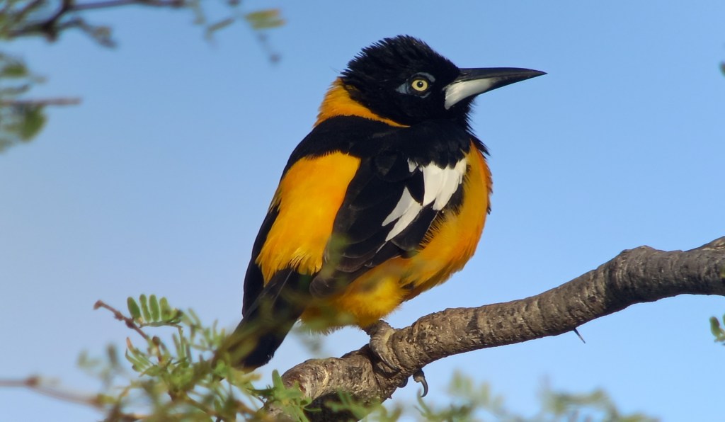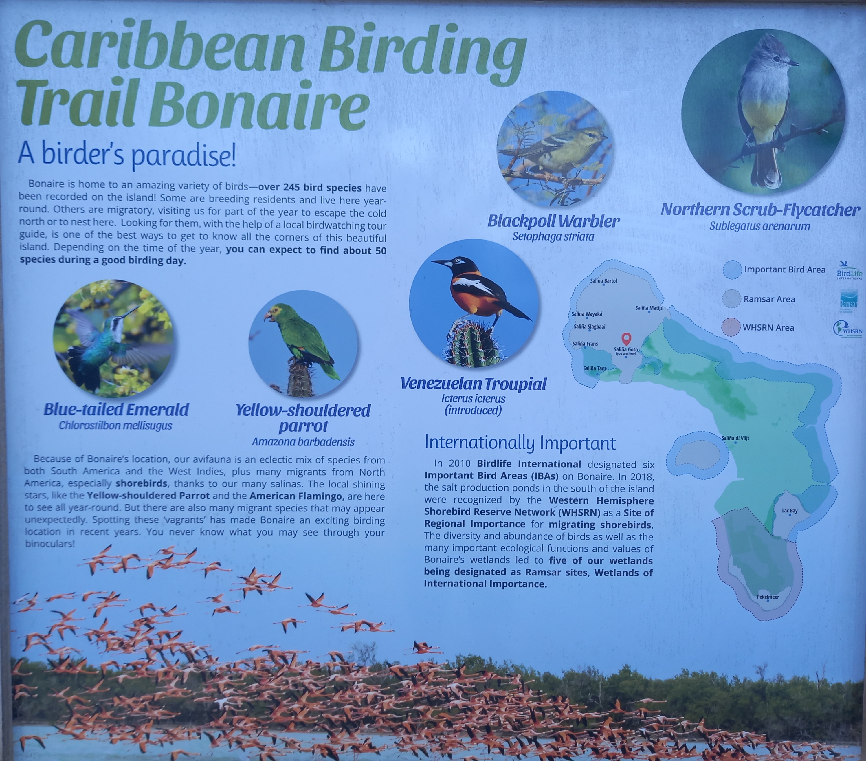 We zien de ene na de andere prachtsoort: roodhalsreiger en het Amerikaanse neefje van onze Europese grote zilverreiger, de Amerikaanse grote zilverreiger. Amerikaanse steltkluten, grote geelpootruiter, kleine geelpootruiter, Caribische flamingo’s en ook de eerste eenden, een negental Bahamapijlstaarten. Terwijl we richting een uitkijkpunt fietsen worden we overspoeld door een scala aan kleurrijke zangvogels. Oranje troepialen, gele troepialen, maïsparkieten, witoogspotlijster, suikerdiefje, gele zanger, maskergrondvink. De oranje troepiaal is naar mijn smaak de mooiste soort die we hier zien in de top van een struik. De vogel zingt af en toe, waarna deze wordt verjaagd door een soortgenoot. Oranje troepiaal is de nationale vogel van Venezuela, vandaar staat de soort ook bekend als Venezolaanse troepiaal. Net zoals de Caribische flamingo de nationale vogel van Bonaire is, en de grutto voor Nederland. Vogels als symbool, niet alleen vanwege het kleurrijke uiterlijk, ook omdat het land waar ze symbool voor staan in meerdere opzichten essentieel is als leefgebied.