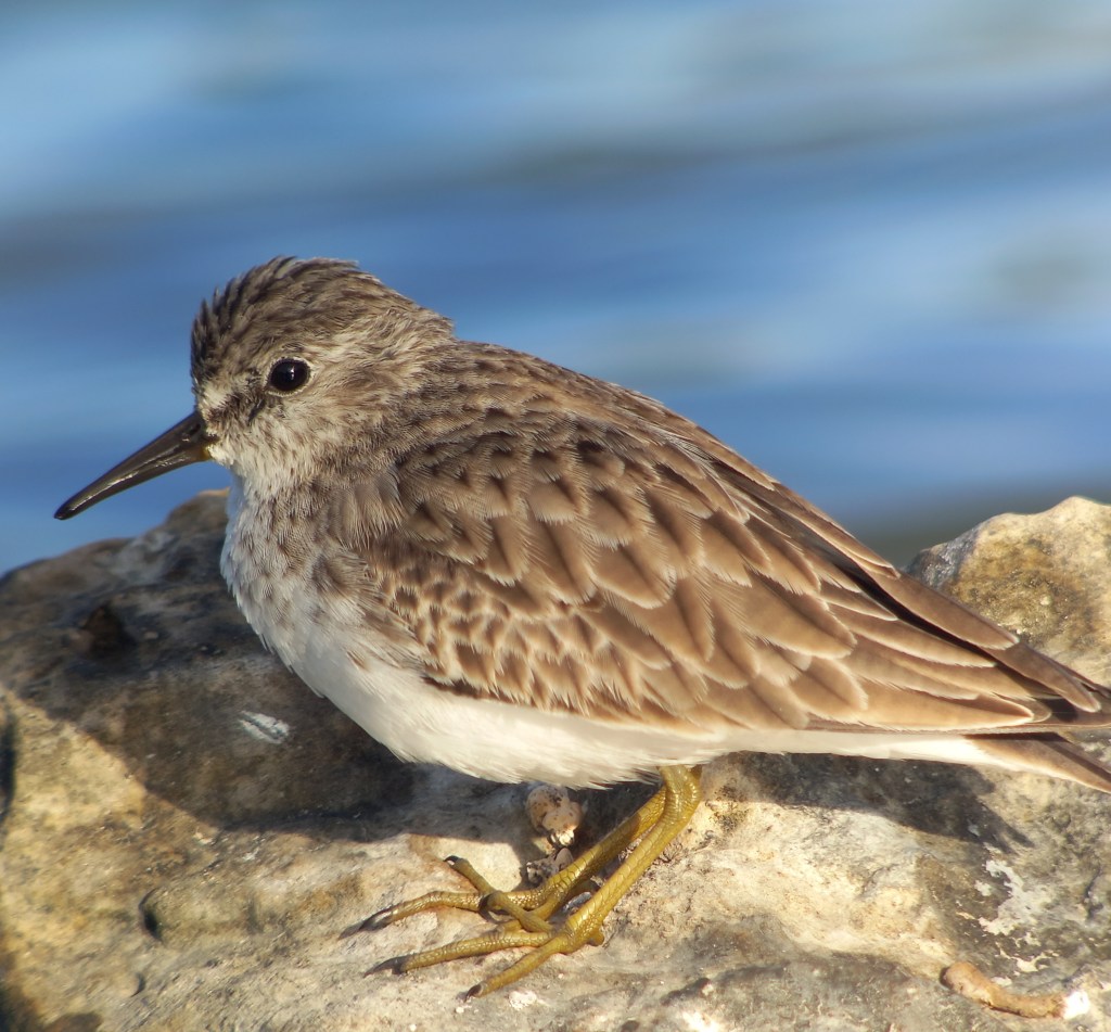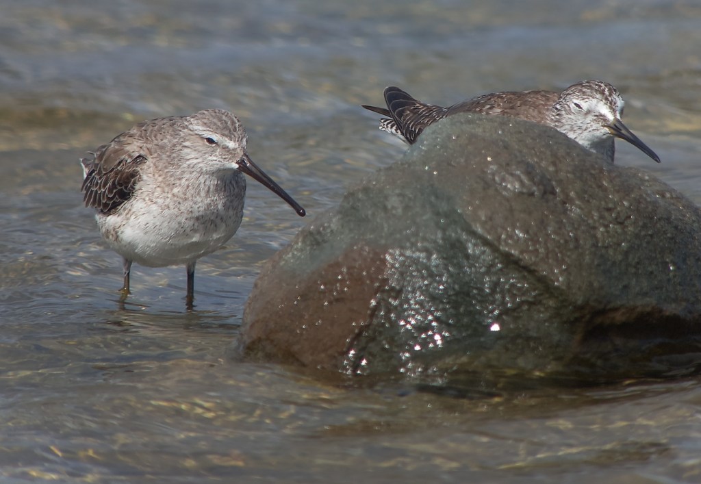 Een stukje verderop nemen we positie op het uitzichtpunt ‘Mirante’, vanwaar we een prachtig uitzicht hebben over het Gotomeer en het omliggende bergachtige landschap. Het doet wel wat denken aan Jurassic Park. Verspreid in het meer staan flamingo’s, visarenden vliegen rond, maar ook tientallen boerenzwaluwen foeragerend op insecten. Vanaf het uitzichtpunt dalen we af naar de weg ‘Kaminda Goto’, welke langs de oostkant van het meer loopt. Vanaf hier zijn groepen flamingo’s wel erg mooi te bekijken. Ook laten veel steltlopers zich hier mooi observeren. Kleine geelpootruiters zijn goed vertegenwoordigd, grote geelpootruiter is schaarser. Ook zien we hier een grijze strandloper op grote afstand foerageren. Kleinste strandlopers daarentegen zitten pal langs de weg, bijna onzichtbaar. Je kijkt er makkelijk overheen, die kleine en goed gecamoufleerde verenbolletjes. Even verderop staan twee steltstrandlopers mooi dichtbij.