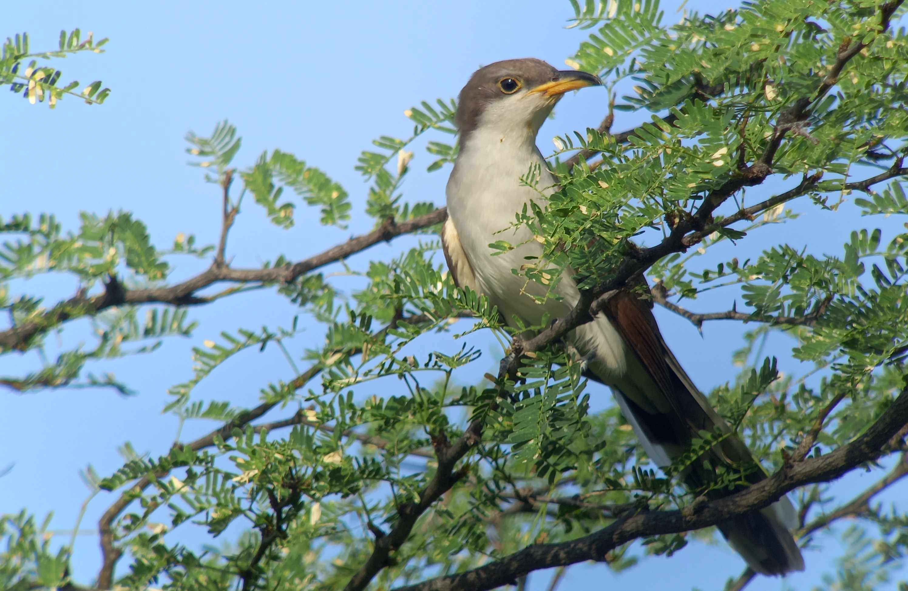 Een soort die lang op mijn verlanglijstje stond. In oktober 2022 werd de eerste geelsnavelkoekoek voor Nederland ontdekt op de Maasvlakte (nabij Rotterdam). Slechts een handvol gelukkige vogelaars waren op tijd om deze vogel te zien, alvorens deze het water in vloog en verdronk (en onderkoeld raakte). Een trieste afloop van zo’n bijzondere ontdekking en mooie vogel, die ongetwijfeld vanuit Noord-Amerika met een schip is meegekomen en vervolgens verzeilt is geraakt op de Maasvlakte. De vogel maakte bij ontdekking al een verzwakte indruk. Maar dit exemplaar op Bonaire is zeer levendig, verdwijnt al snel uit zicht. Helaas, want ik stond op het punt de vogel op de gevoelige plaat vast te leggen. Geelsnavelkoekoek is een onmiskenbare soort: naast de overwegend gele snavel zijn de witte onderzijde, bruine bovenzijde met kaneelkleurige tekening op vleugels en een zwartwit getekende lange staart typerend. Even verderop hebben we meer geluk, want een drietal geelsnavelkoekoeken laat zich langdurig van dichtbij bekijken. De vogels zijn alert, maar niet heel schuw.