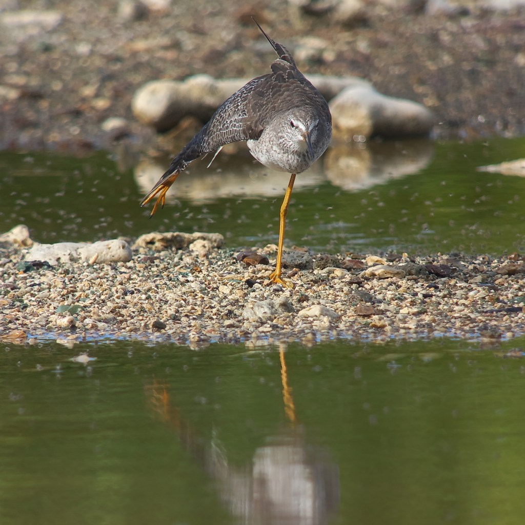 Omdat de zon in kracht toeneemt, besluiten we weer wat beschutting op te zoeken onder bomen. Maar niet voordat we nog even de tijd hebben genomen om enkele kleine geelpootruiters te observeren. De vogels lopen zo dichtbij, zo krijg je ze in Nederland niet of zelden te zien. En ook nog met gunstige lichtomstandigheden. Zelfs wanneer we de vogels voorzichtig benaderen, blijven ze rustig ter plaatse. Druk foeragerend en af en toe het verenkleed poetsend. Ook leuk is een groepje foeragerende oeverzwaluwen.